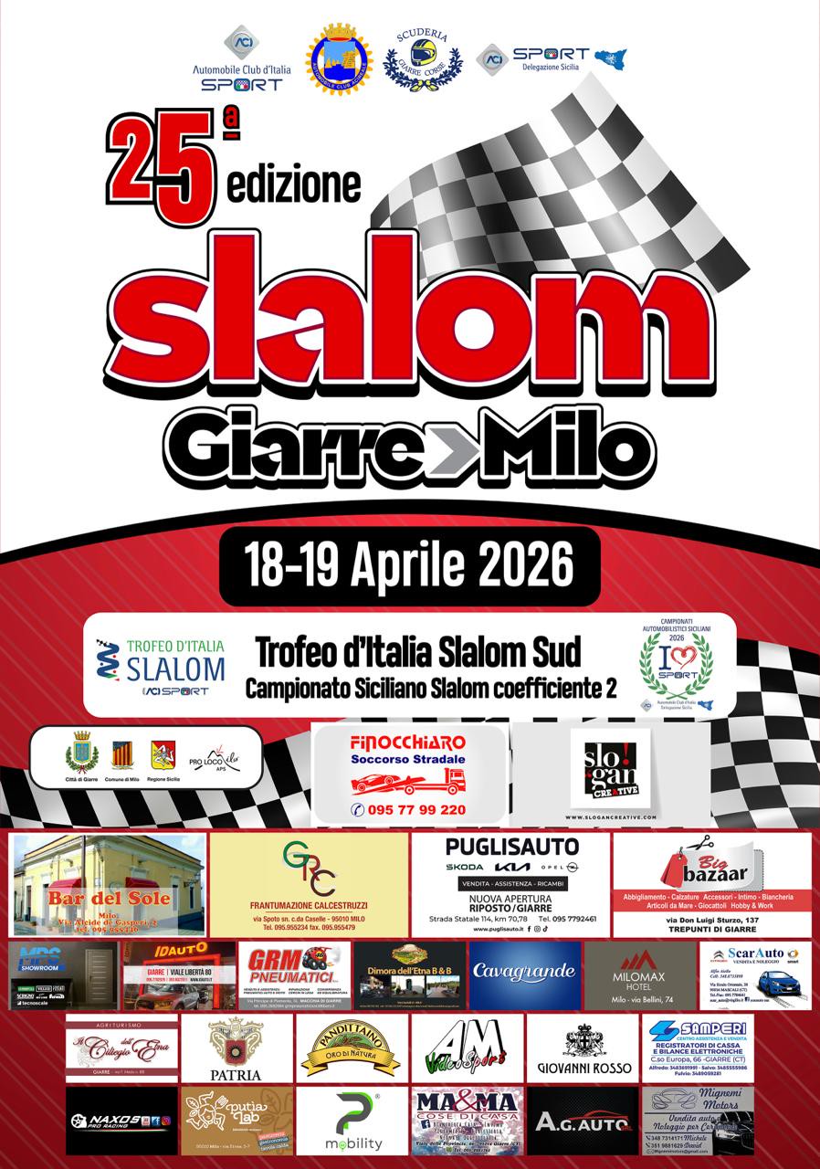 Tutto pronto per la 25ª edizione dello Slalom Giarre–Milo, in programma sabato 18 e domenica 19 aprile, primo grande appuntamento della stagione automobilistica in provincia di Catania. Due giorni all’insegna dello sport, della tecnica e dell’adrenalina lungo lo storico tracciato di circa 3 chilometri, uno dei più apprezzati del panorama siciliano, che si snoda tra tornanti e scorci suggestivi alle pendici dell’Etna. La manifestazione, organizzata dall’Automobile Club Acireale in collaborazione con la Scuderia Giarre Corse, si conferma tra gli eventi motoristici più attesi del territorio, capace di richiamare piloti specialisti della disciplina e numerosi appassionati. Iscrizioni già aperte, con grande attesa per la partecipazione dei migliori interpreti dello slalom, pronti a contendersi i primi punti della stagione in una gara che, come da tradizione, premierà precisione e abilità più che velocità pura. Il percorso, infatti, sarà caratterizzato dalla presenza di postazioni di rallentamento (birilli), che metteranno alla prova la destrezza dei concorrenti.