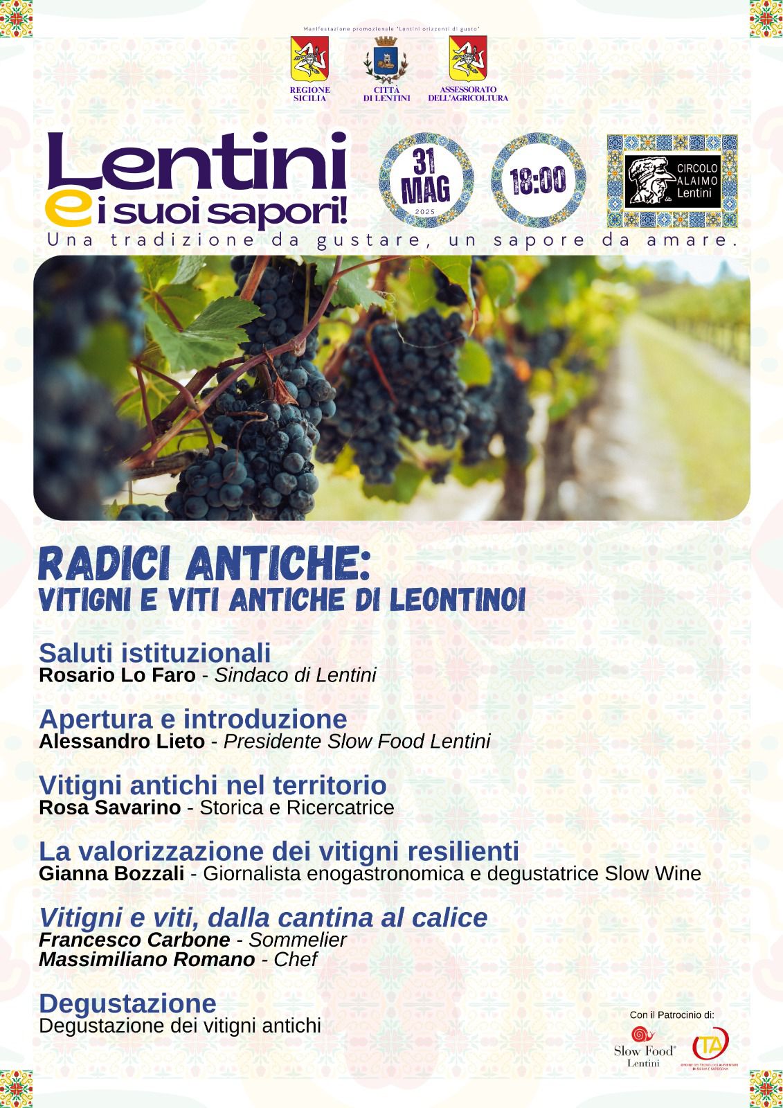 Si inizia Venerdì 31 Maggio alle 18 al Circolo Alaimo – Lentini con il convegno intitolato “Radici antiche: vitigni e viti antiche di Lentini”, un incontro per riflettere sul valore storico e culturale della vite nel territorio lentinese e sulle prospettive di rilancio sostenibile. La coltivazione della vite nella provincia siracusana, infatti, ha origini antichissime, risalenti all’epoca greca e romana, favorita dalla fertilità del suolo e dal clima favorevole.