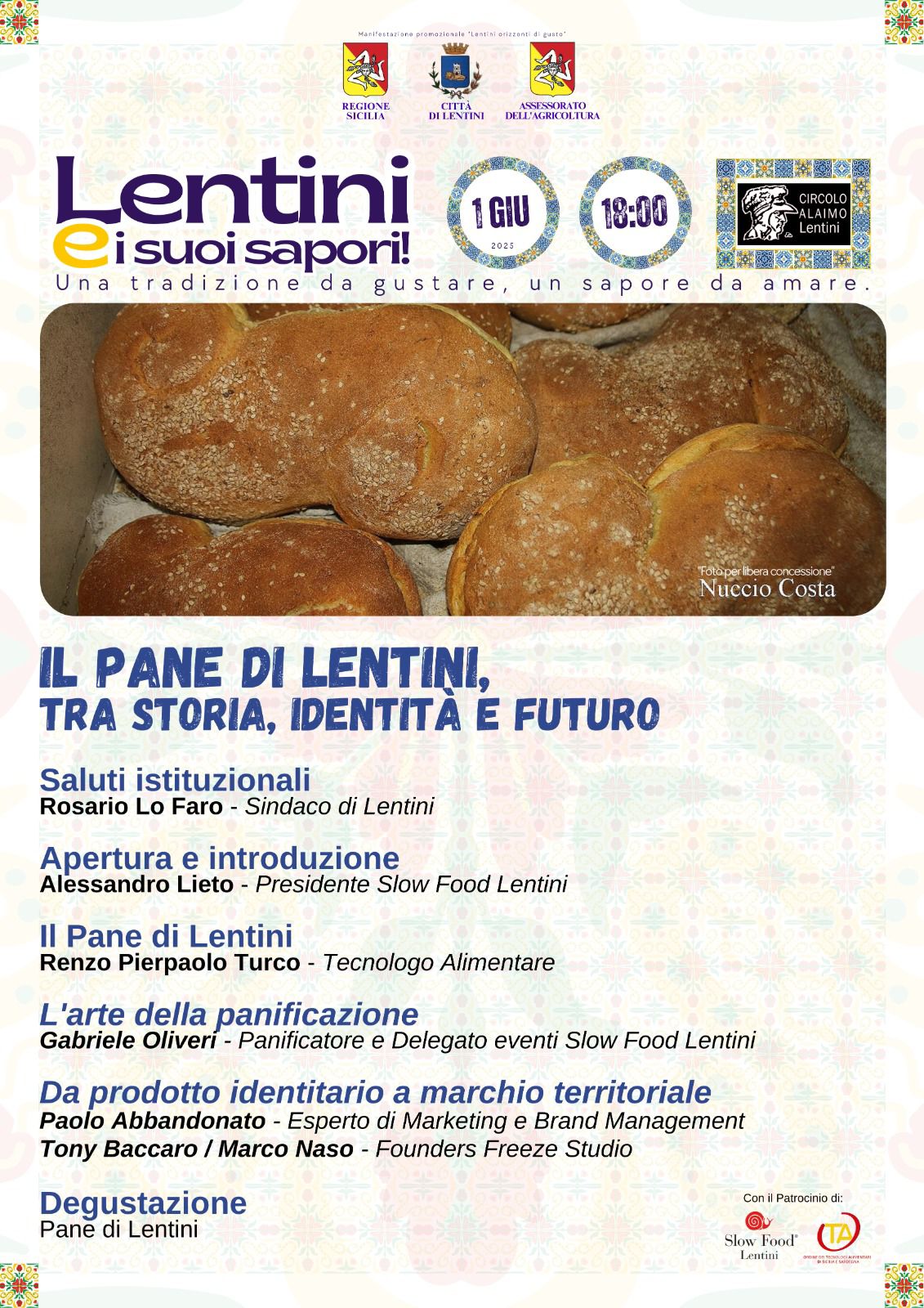 I Comune di Lentini, tra i numerosi appuntamenti del programma, propone una mini rassegna di eventi in collaborazione con Slow Food, dedicati a due simboli profondi della cultura siciliana e mediterranea: il pane e il vino. In particolar modo, grazie anche al patrocinio dell’Ordine dei Tecnologi Alimentari, promuove dei momenti di approfondimento dedicati a due simboli dell’identità lentinese: la viticoltura e il pane di Lentini. Le conferenze si terranno il 31 maggio e il 1° giugno presso il Circolo Alaimo, nell’ambito dell’iniziativa “Lentini e i suoi sapori”, promossa dal Comune di Lentini con il contributo dell’Assessorato dell’agricoltura, dello sviluppo rurale e della pesca mediterranea della Regione Siciliana.