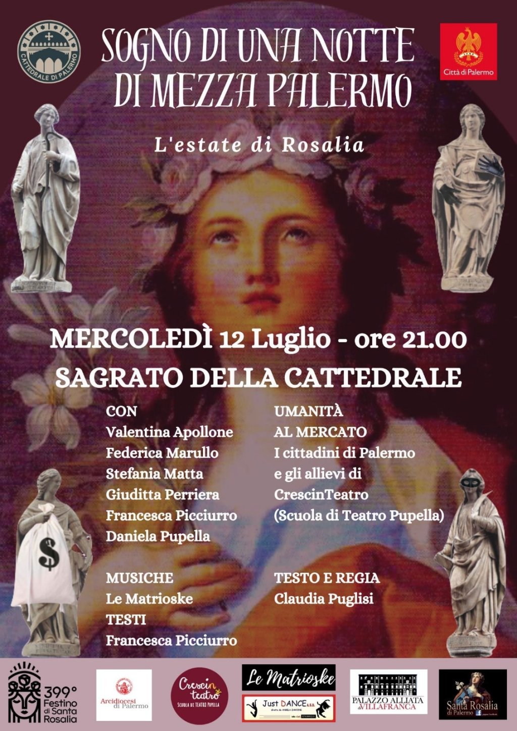 Mercoledì 12 luglio, alle ore 21, sul Sagrato della Cattedrale di Palermo, andrà in scena lo spettacolo teatrale dal titolo “Sogno di una notte di mezza Palermo. L’estate di Rosalia” che vedrà protagoniste, sul palco, Valentina Apollone, Federica Marullo, Stefania Matta, Giuditta Perriera, Francesca Picciurro e Daniela Pupella. Testo e regia di Claudia Puglisi; musiche de Le Matrioske (Ciccio Piras, Virginia Maiorana, Simona Ferrigno), mentre i testi delle canzoni sono di Francesca Picciurro.
