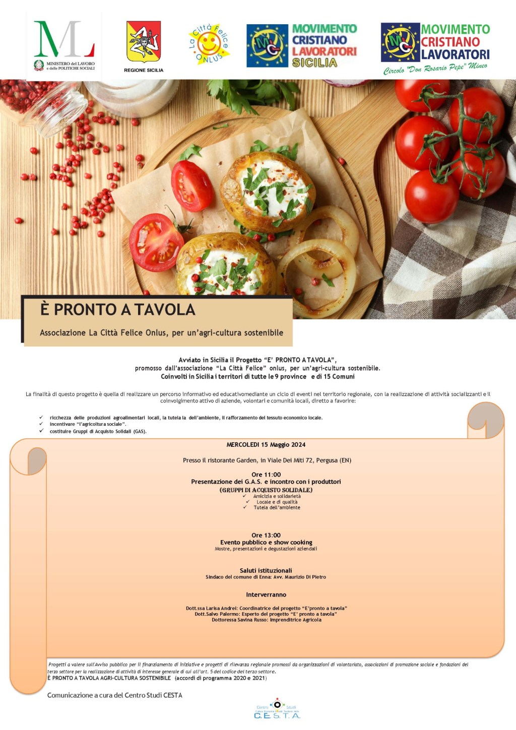Nuovi orizzonti per l’agricoltura siciliana con il progetto “È pronto a tavola” ideato dall’associazione La Città Felice Onlus con il patrocinio del Ministero del lavoro e delle politiche sociali e della Regione Siciliana e in collaborazione con il MCL- Sicilia e il circolo di MCL di Mineo “Rosario Pepe”, che il prossimo 15 maggio farà tappa presso il ristorante Garden in Viale Dei Miti 72, Pergusa (EN), per offrire un’esperienza sensoriale all’insegna dell’agri-cultura sostenibile.