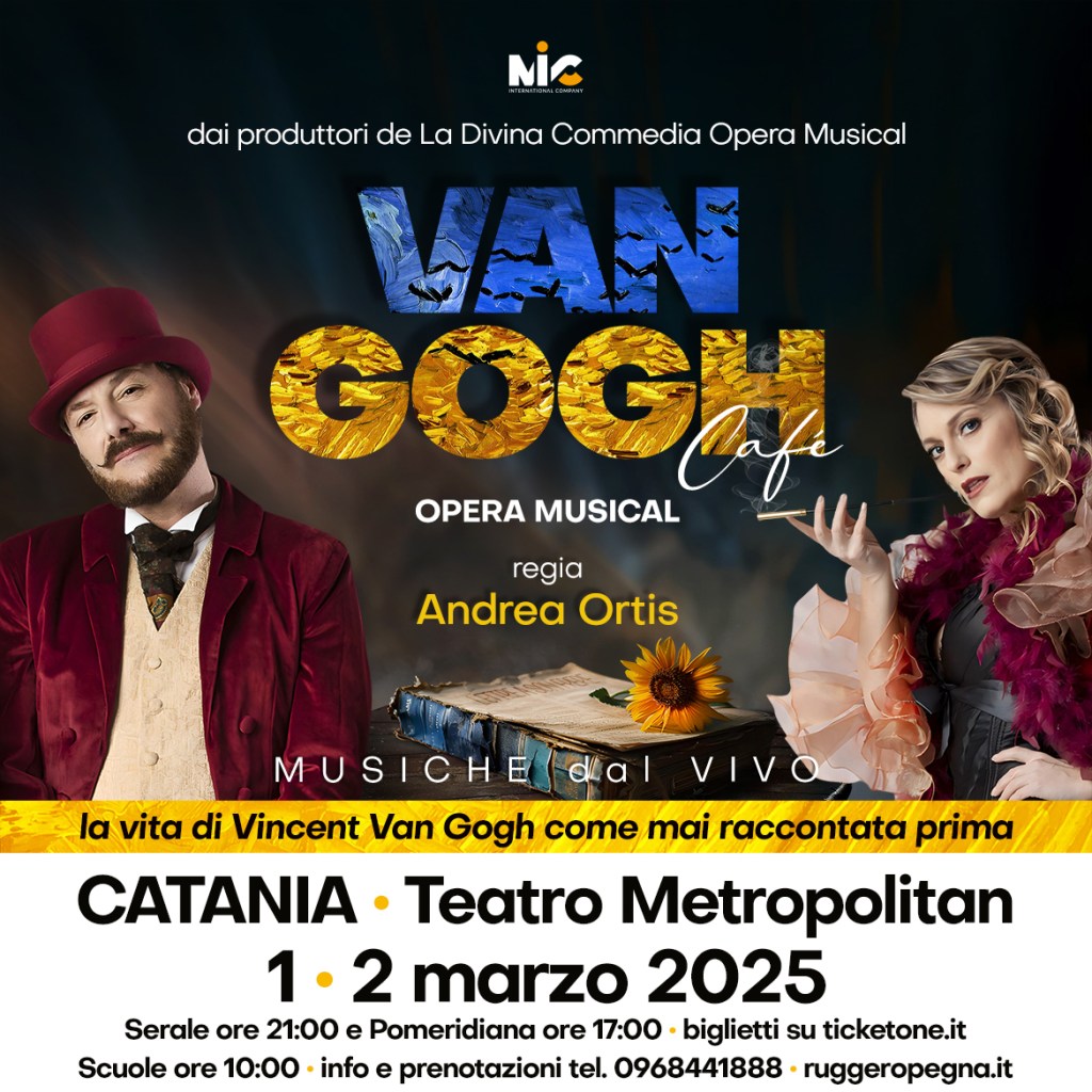 In attesa dell’ultima replica di stasera del musical Grease al Teatro Cilea di Reggio Calabria, il promoter Ruggero Pegna ha confermato le tappe in Calabria e Sicilia della spettacolare “Van Gogh Cafè Opera Musical”, comunicando che da oggi al 2 dicembre è attiva la speciale “Promo Black Friday” con lo sconto del 25% su tutte le tipologie di biglietti, acquistabili online su ticketone.it e nei punti autorizzati. Lo straordinario spettacolo scritto e diretto da Andrea Ortis, che trae ispirazione dalle opere e dalla vita del celebre pittore olandese, con effetti immersivi in 3D, sarà nei giorni 1 marzo alle ore 21 e 2 marzo alle ore 17 al Teatro Metropolitan di Catania, 4 e 5 marzo al Teatro Cilea di Reggio Calabria e, infine, 7 e 8 marzo al Teatro Politeama di Catanzaro, con l’organizzazione della Show Net di Ruggero Pegna.