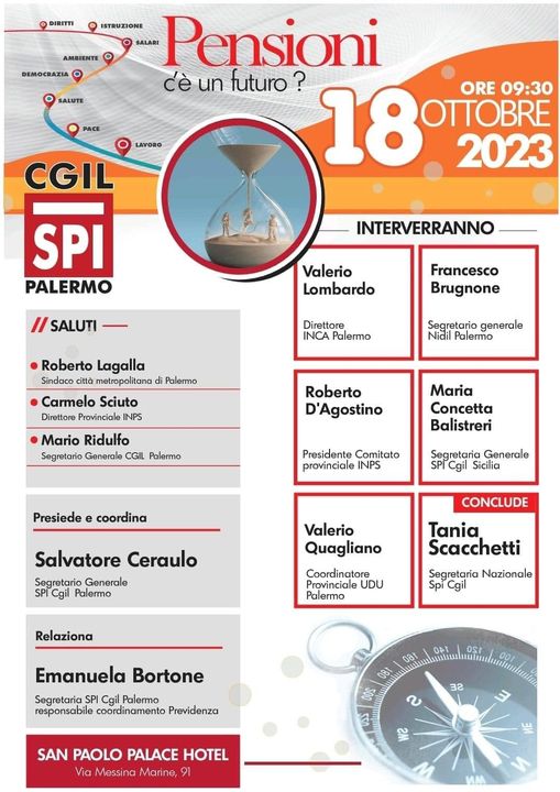 Ecco il quadro sul quale si aprirà confronto “Pensioni, c’è un futuro?” presieduto dal segretario generale Spi Cgil Palermo Salvatore Ceraulo, interverranno il direttore Inca Palermo Valerio Lombardo, il segretario generale Nidil Cgil Palermo Francesco Brugnone, il presidente comitato provinciale Inps Roberto D’Agostino, Valerio Quagliano, coordinatore Udu Palermo, la segretaria generale Spi Cgil Sicilia Maria Concetta Balistreri. Saluti del sindaco Roberto Lagalla, del direttore provinciale Inps Carmelo Sciuto, del segretario generale Cgil Palermo Mario Ridulfo.
