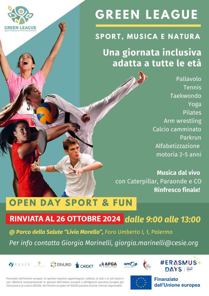 Sabato 26 ottobre una mattina di sport e divertimento al Parco al Foro Italico di Palermo con Green League, progetto europeo che ha l’obiettivo di migliorare il legame tra sport e ambiente attraverso l’apprendimento esperienziale, promuovendo l’attività fisica all’aperto come strumento di sensibilizzazione ambientale e incoraggiando pratiche sostenibili nello sport.