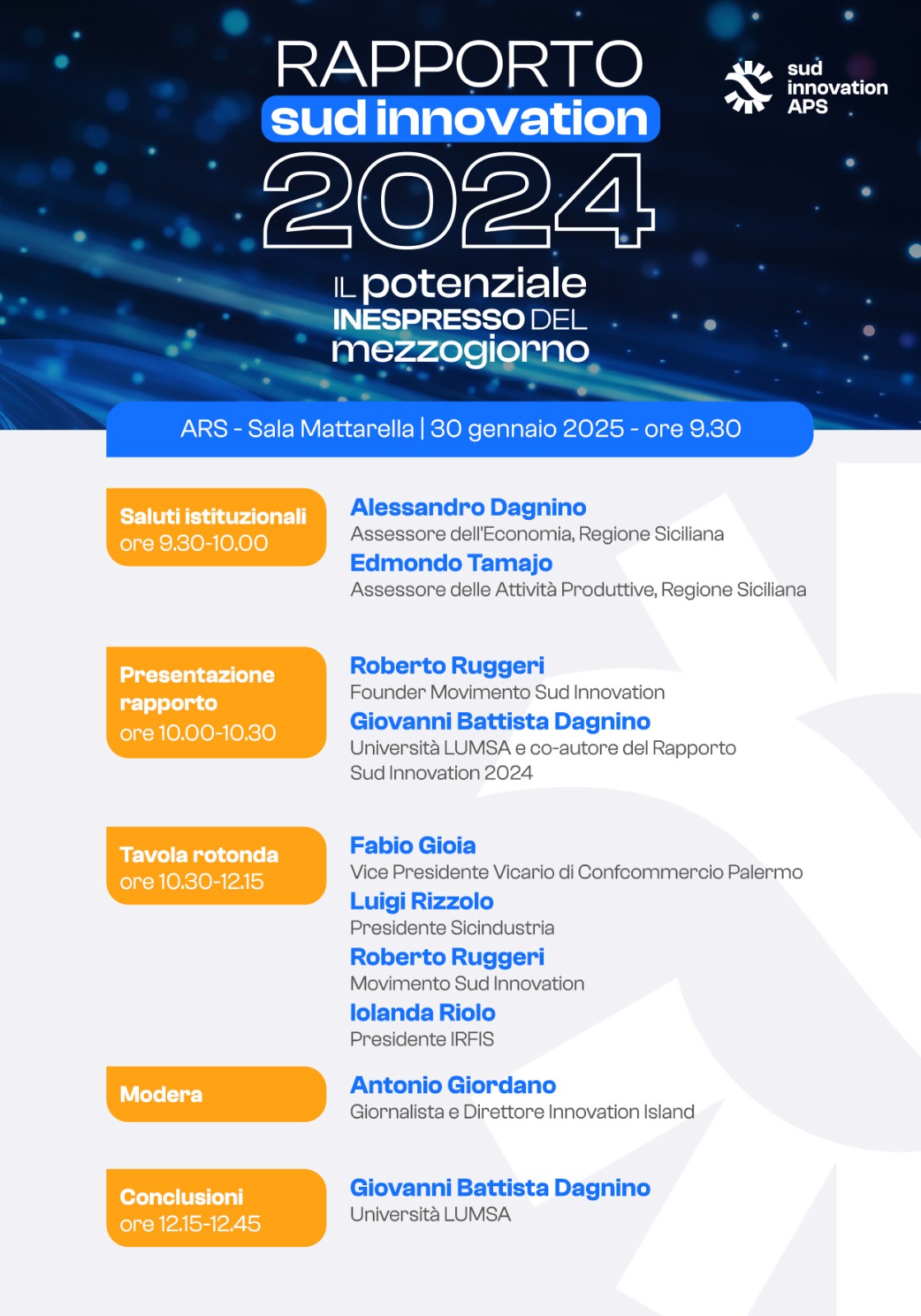 Dopo i saluti di Alessandro Dagnino, Assessore dell’Economia della Regione Siciliana e di Edy Tamajo, Assessore delle Attività Produttive della Regione Siciliana, i lavori proseguiranno con la presentazione del rapporto a cura di Roberto Ruggeri, Founder di Movimento Sud Innovation, e Giovanni Battista Dagnino, Università LUMSA.