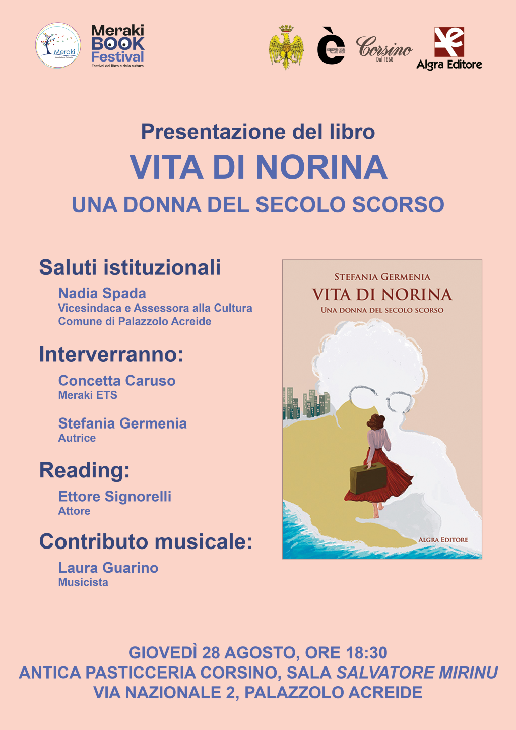 Ospite della sala Salvatore Mirinu, presso l’Antica Pasticceria Corsino, la scrittrice Stefania Germenia presenterà il suo ultimo romanzo Vita di Norina. Una donna del secolo scorsotrimonio combinato. Esclusa e subalterna, ma non fuori dalla Storia, la sua lunga vita attraversa tutto il Novecento: fascismo, guerra, dopoguerra e ricostruzione, industrializzazione ed e (Algra Editore), storia di una donna ai margini, contadina calabrese costretta ad abbandonare la scuola a causa delle ristrettezze economiche familiari e poi “spedita” in una Sicilia dilaniata dalla guerra e dalla miseria per aver osato opporsi a un matrimonio combinato. Esclusa e subalterna, ma non fuori dalla Storia, la sua lunga vita attraversa tutto il Novecento: fascismo, guerra, dopoguerra e ricostruzione, industrializzazione ed emigrazione transoceanica.