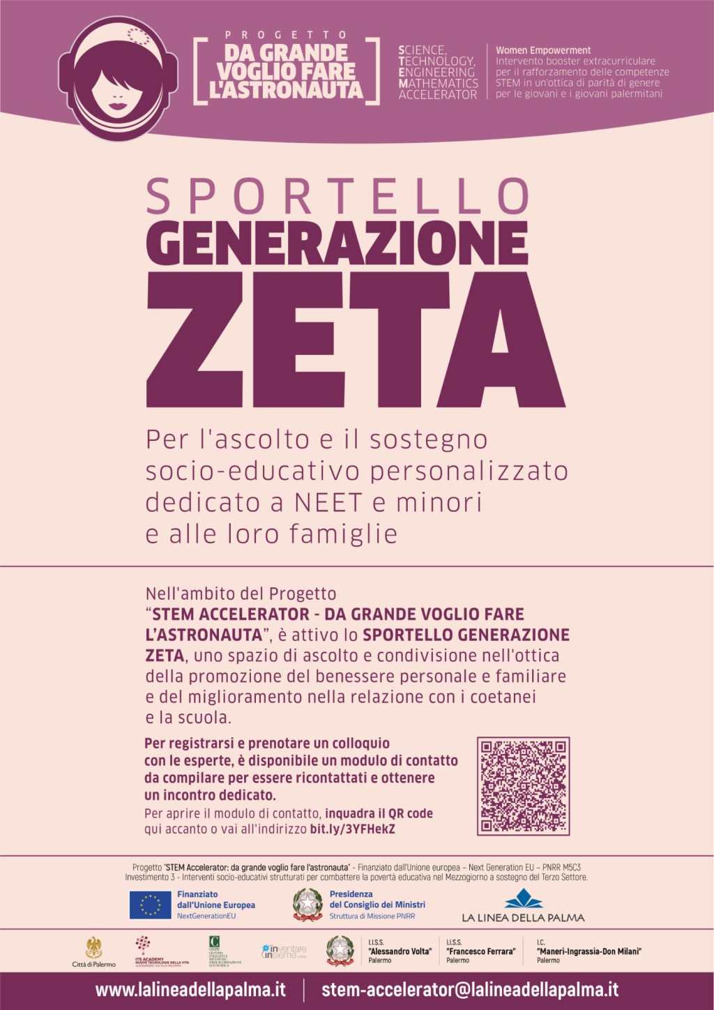 Nell’ambito delle attività inserite nel Progetto “STEM Accelerator: da grande voglio fare l’astronauta”, è stato ufficialmente avviato lo Sportello Generazione Z, un’iniziativa dedicata alla promozione del benessere personale e familiare, oltre al miglioramento delle relazioni con i coetanei e la scuola. Questo spazio innovativo è stato concepito come un punto di riferimento per la comunità scolastica degli Istituti d’Istruzione Superiori A. Volta e F. Ferrara, nonché dell’ICS Maneri-Ingrassia-Don Milani di Palermo.
