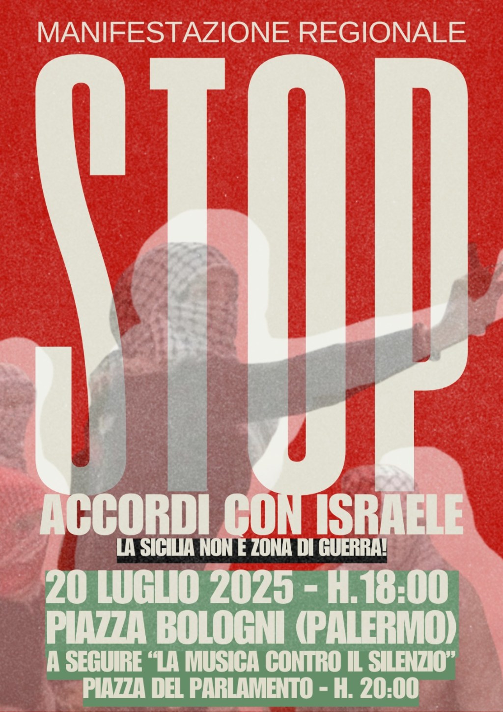 Il 20 Luglio ci troveremo di nuovo in piazza a Palermo, con una manifestazione regionale per chiedere l’interruzione degli accordi con Israele e per esprimere la nostra solidarietà incondizionata con la resistenza del popolo palestinese.