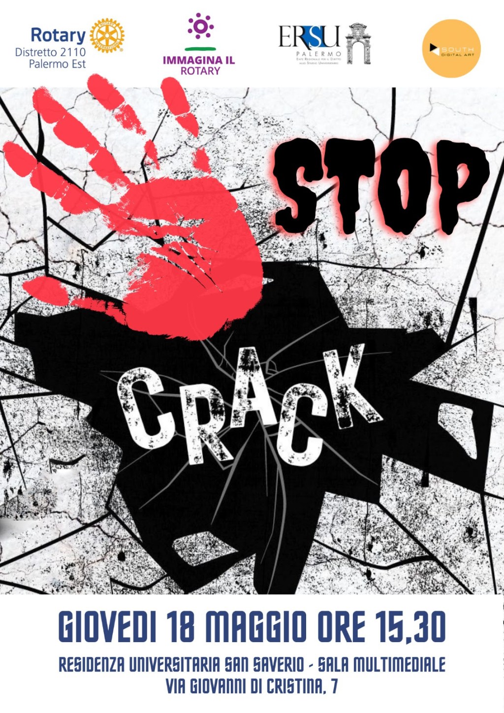 Il Rotary Club Palermo Est, in collaborazione con ERSU Palermo, ha organizzato, con inizio alle ore 15:30 di giorno giovedì 18 maggio 2023, presso la Sala multimediale della residenza universitaria San Francesco Saverio (via Giovanni Di Cristina 7, Palermo), “STOP crack”, conferenza di sensibilizzazione sul tema della dipendenza dal crack.