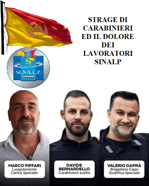 La Confederazione Sindacale SINALP esprime profondo cordoglio per la tragica perdita dei tre valorosi Carabinieri, Marco Piffari, Davide Bernardello e Valerio Daprà, caduti durante le operazioni di sgombero di un’abitazione a Castel D’Azzano, in via San Martino nel Veneto.