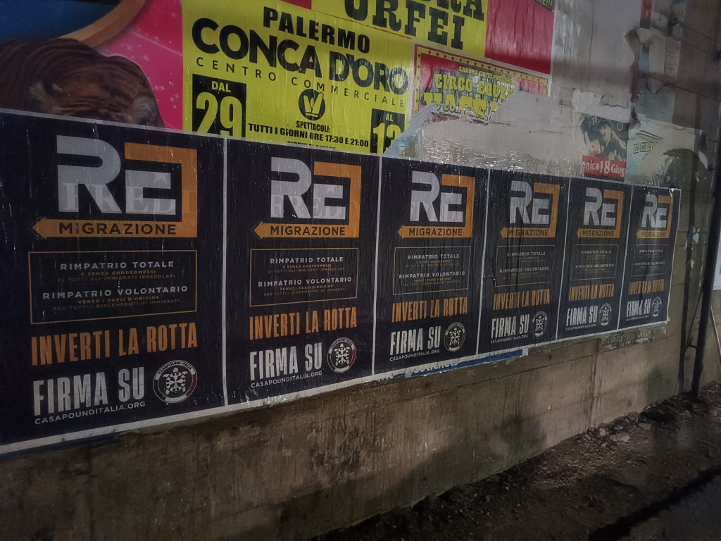 Nella serata di ieri, militanti di CasaPound Italia hanno affisso in tutta Italia, anche a Palermo, manifesti e striscioni sulla remigrazione, ribadendo la necessità di un intervento concreto contro l’immigrazione incontrollata e per il ritorno nei Paesi d’origine di chi non ha diritto di restare.
