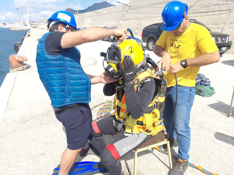 «Il rimanente 20% – prosegue Kouvakis – viene completato con il successivo corso Inshore Diver che prevede dei crediti formativi per chi ha già svolto l’OTS. Tutte le altre scuole di subacquea non arrivano a coprire neanche il 20% del percorso indicato dalla legge. Questo enorme divario impedisce di proseguire il percorso formativo da noi a chi ha già avuto una formazione altrove. Dura lex, sed lex. Con il corso Ots che stiamo attualmente svolgendo abbiamo fin qui realizzato 90 giorni sui 125 previsti dal percorso formativo con queste caratteristiche: Scuba da 0-19 metri realizzate 337 immersioni con 13.459 minuti; Scuba da 20-3 metri realizzate 88 immersioni con 3.063 minuti; Surface (aria tramite ombelicale dalla superficie) da 0-19 metri realizzate 216 immersioni con 3.897 minuti; Surface (aria tramite ombelicale dalla superficie) da 20-30 metri realizzate 51 immersioni con 1735 minuti; comunica- zione (assistente supervisore alle immersioni) realizzati 2700 minuti; gestione dell’ombelicale realizzati 7319 minuti; assistenza alla vestizione realizzati 2312 minuti. Infine, come Stand-by sono stati realizzati 2288 minuti. Questi 8 step vengono controllati giornalmente dallo staff dei formatori del Cedifop per poi essere riportati in un primo momento su apposite schede e successivamente passati su un file Excel che verifica i tempi e le medie di ogni allievo. Tutto questo proprio come riportato all’articolo n.2 del regolamento del Centro Studi Cedifop».