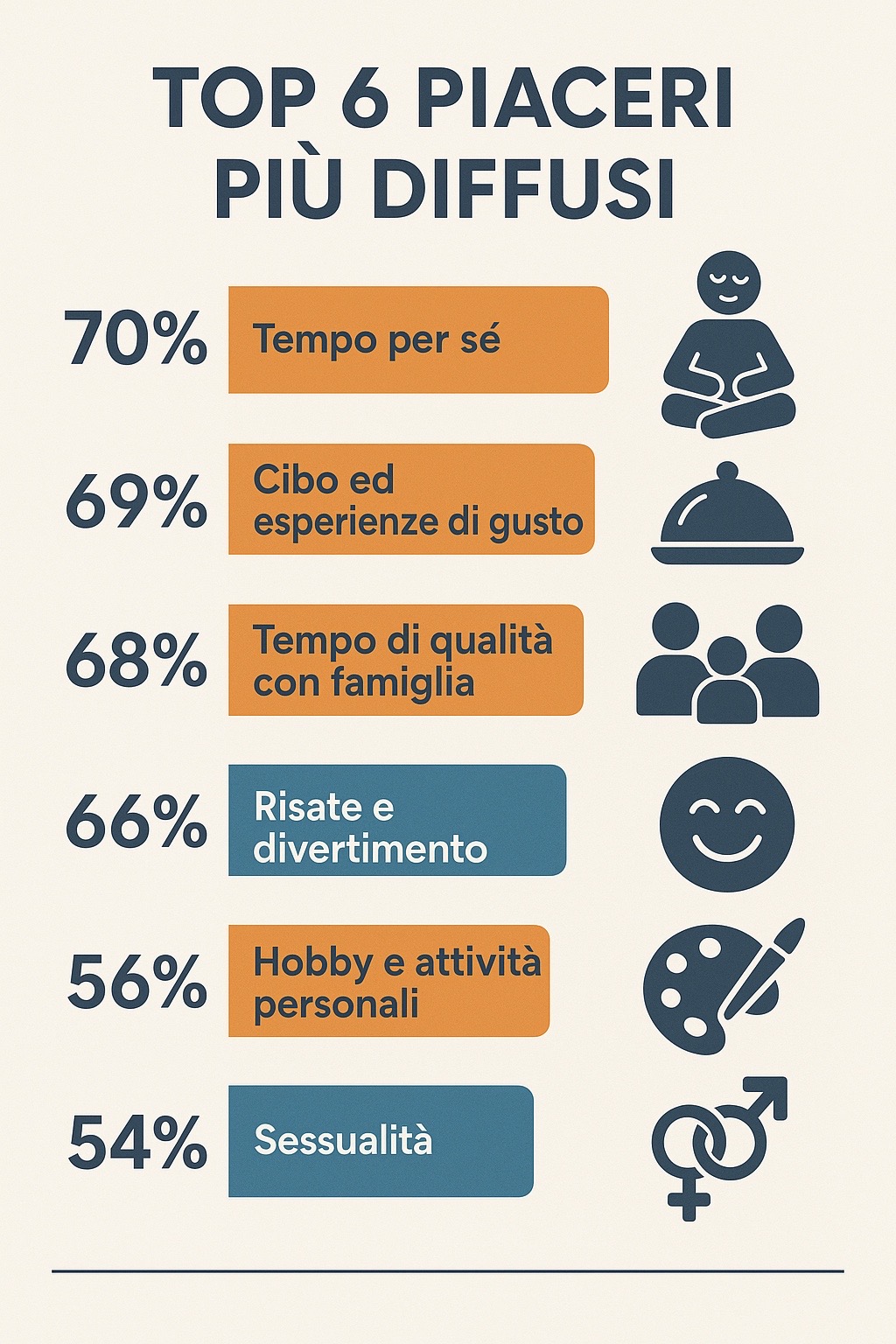 Questi dati restituiscono un quadro chiaro: oggi il piacere degli italiani non è più legato a lusso, status o apparire, ma a esperienze autentiche, relazioni significative e momenti di benessere personale.