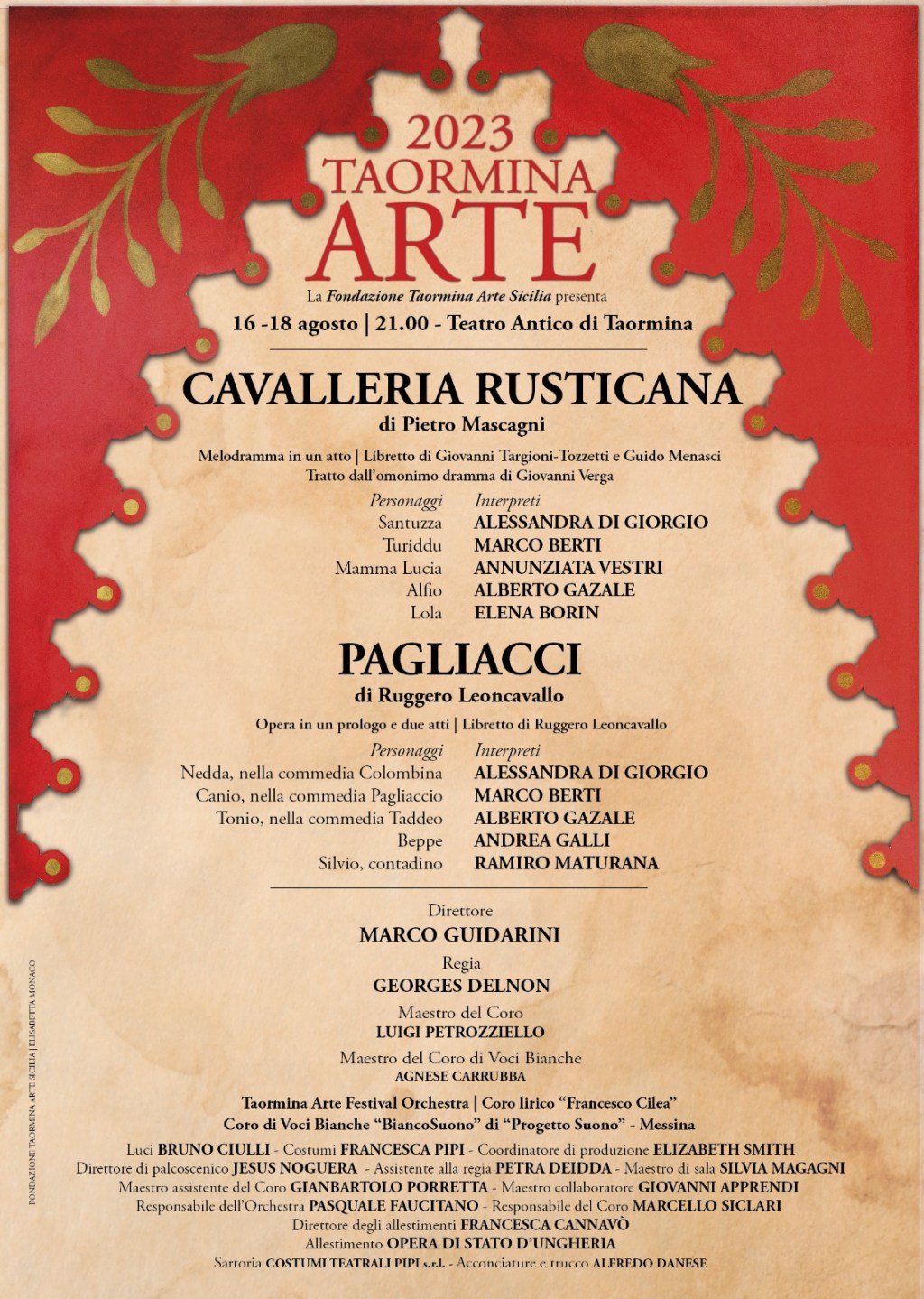 A dirigere la Taormina Arte Festival Orchestra sarà il Maestro Marco Guidarini che afferma: “Cavalleria rusticana e Pagliacci sono due capolavori del melodramma italiano che inaugurano un modo nuovo di concepire il teatro in musica. L’ispirazione letteraria e il fatto di cronaca delle due opere condividono una poetica che si ispira alla realtà della vita, nel segno di passioni vissute, dentro e fuori dal palcoscenico. La cornice metafisica del Teatro Antico di Taormina, tra cielo e terra, partecipa in maniera unica al mondo di questo viaggio nel cuore dell’uomo. Ci riconduce alla bellezza misteriosa del mito greco presente in modo misterioso nei due lavori, dove la magia della natura si fonde con quella dell’arte, rivelandoci la dimensione del sacro”.