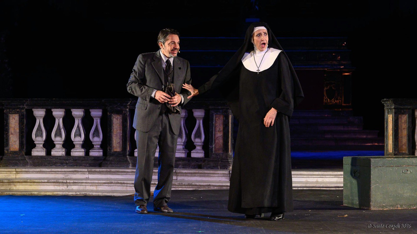 c) Ivan Giambirtone nei panni del cavalier Pennisi e Barbara Gallo in quelli di Madre Mirella