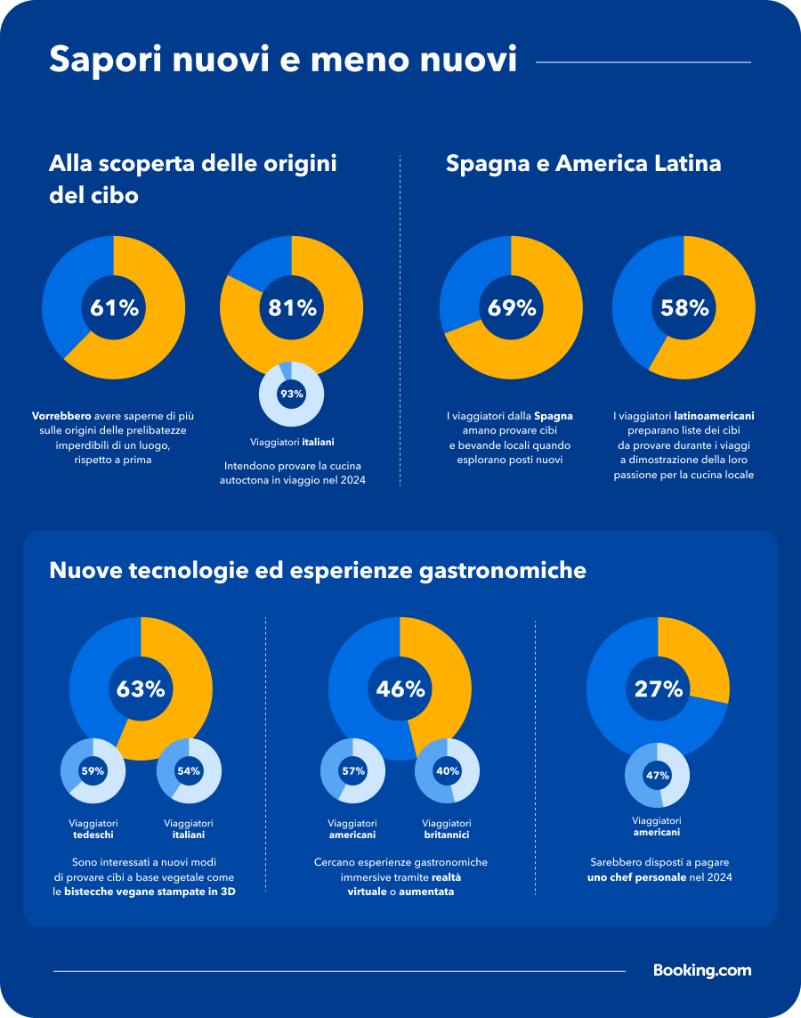 Il desiderio di esplorare nuovi orizzonti gastronomici sta guidando le scelte di viaggio del 2024 (ricerca di Booking.com), con il 78% dei viaggiatori alla ricerca di sapori innovativi. La metà di loro sta pianificando attentamente i propri itinerari basandosi su piatti o ristoranti specifici, mentre il 61% attribuisce grande importanza alla conoscenza delle radici culinarie di una destinazione.