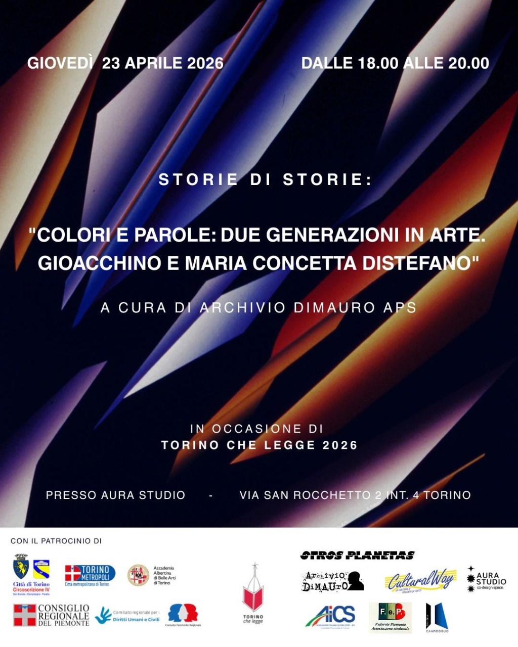 L’evento – organizzato in occasione del centenario della nascita di Gioacchino Distefano – fa parte della rassegna “Otros planetas: el mundo en tu casa” Progetto promosso da “Archivio DiMAUrO Aps” ed è inserito in “Torino che legge …” , manifestazione organizzata dal Forum del libro, dalla Città di Torino con le sue Biblioteche civiche, dal Salone Internazionale del Libro di Torino e dalle circoscrizioni cittadine, in occasione della “Giornata Mondiale del Libro e del Diritto d’Autore” che si celebra proprio il 23 aprile.