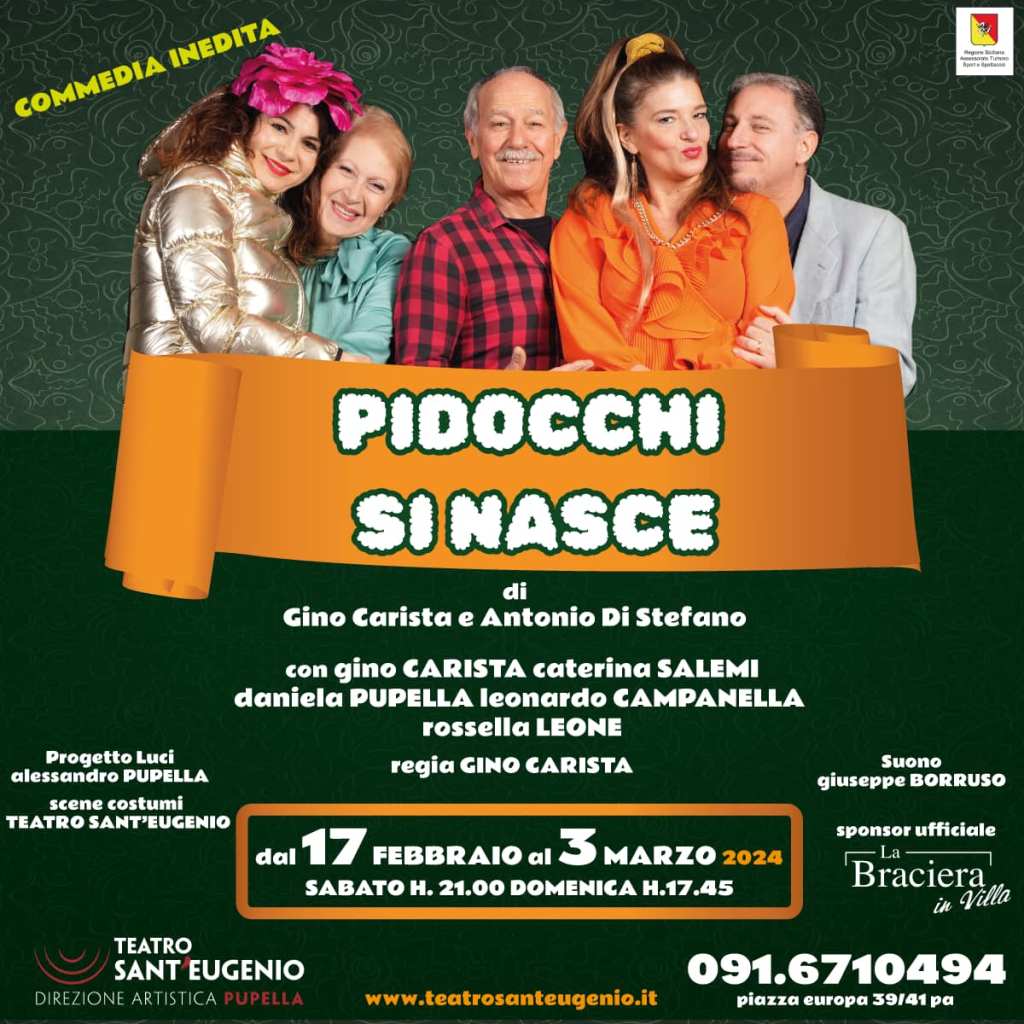 Dal 17 febbraio al 3 marzo, nei giorni di sabato (ore 21) e domenica (ore 17,45) al teatro Sant’Eugenio – Direzione artistica Pupella va in scena la divertentissima ed inedita commedia “Pidocchi si nasce” che chiude la trilogia dei “Pidocchi”, dopo Pidocchi riusciti e Pidocchi scaduti. Sul palco vedremo Gino Carista, Caterina Salemi, Daniela Pupella, Leonardo Campanella e Rossella Leone, per la regia di Gino Carista che firma anche il testo insieme ad Antonio Di Stefano. Progetto luci: Alessandro Pupella; scene e costumi: teatro Sant’Eugenio; suono: Giuseppe Borruso.