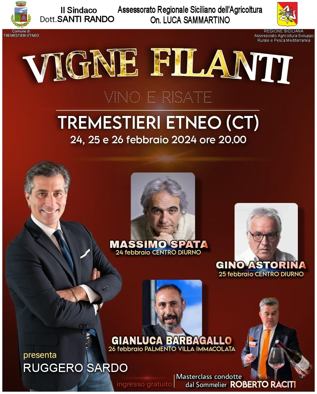 Si parte Sabato 24 febbraio 2024 dalle ore 20.00 con Massimo Spata, il 25 con Gino Astorina nei locali del Centro Diurno, e il 26 febbraio con Gianluca Barbagallo nel Palmento Villa Immacolata, il tutto impreziosito dalla presentazione del noto conduttore siciliano Ruggero Sardo.