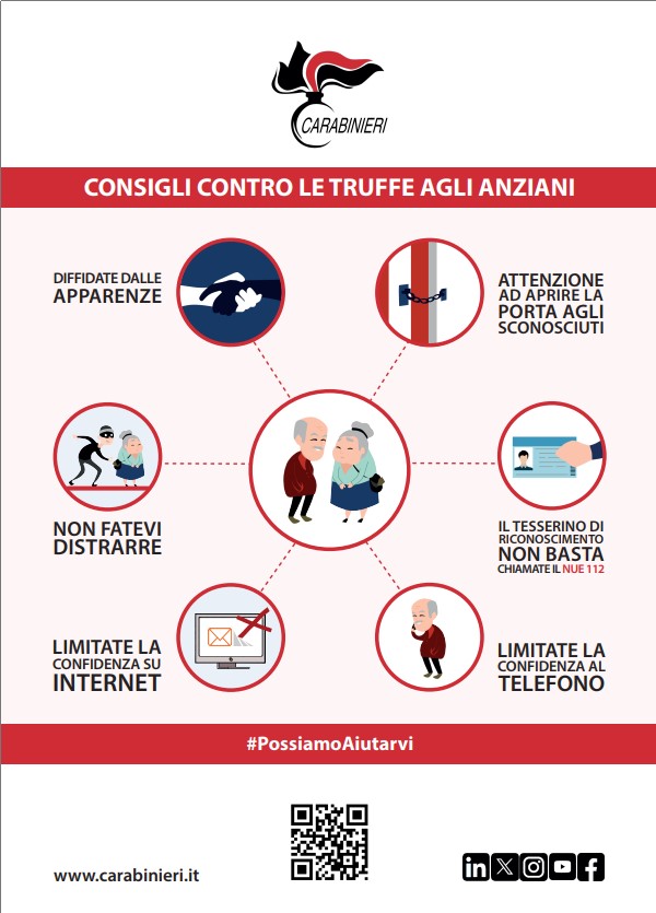 Quanto accaduto dimostra quanto sia importante parlare di questo fenomeno. Ovviamente, come più volte ripetono i Carabinieri in occasione degli incontri con gli anziani sul tema delle truffe, innanzitutto è sempre necessario precisare che le Forze di Polizia assolutamente non si rivolgono ai cittadini chiedendo denaro o preziosi per asseriti pagamenti di cauzioni o altro. Nel caso in cui si viene contattati, è fondamentale chiamare nell’immediatezza il 112, sia da parte di chi ha subito un tentativo di una truffa e sia da parte di chi, purtroppo, si è accorto di esserne stato vittima; la chiamata al numero di emergenza infatti può consentire ai militari dell’Arma e alle altre Forze di Polizia di intervenire subito e individuare con rapidità i responsabili.