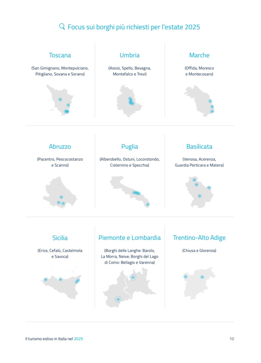 Tra le tendenze più significative registrate dal Centro Studi di Conflavoro, emerge poi il boom del turismo nei borghi e nelle aree rurali, con un incremento del 22,5% rispetto al 2024. Le motivazioni principali di questa scelta risiedono certamente nella volontà di allontanarsi dal clima torrido (38,5%), ma anche nel desiderio di riscoprire il patrimonio culturale (32,7%) e nell’interesse per un turismo sostenibile (28,8%). In crescita borghi meno noti come Pitigliano, Sovana e Sorano (Toscana, +28,3%), Bevagna e Montefalco (Umbria, +24,7%), Offida e Moresco (Marche, +31,2%), Pacentro e Scanno (Abruzzo, +27,8%), fino a Venosa e Guardia Perticara (Basilicata, +29,5%) ed Erice e Castelmola (Sicilia, +25,7%). Emergono, infine, sempre più forti, anche i “distretti di borghi” come Val d’Orcia, Monti Sibillini e Cinque Terre, con tassi di crescita oltre il 30%.