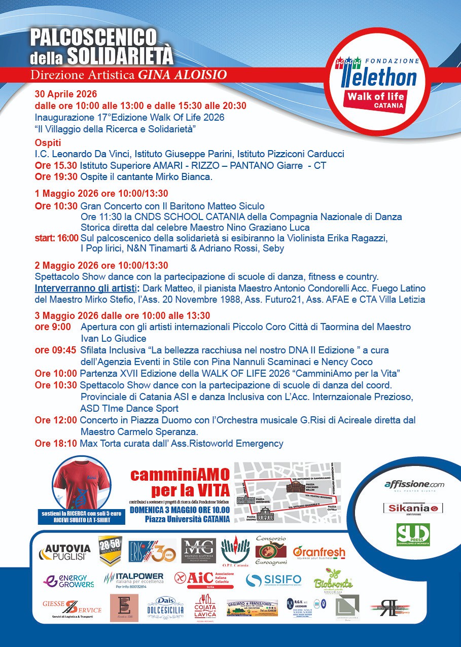 Catania si prepara ad accendere il cuore della solidarietà. Dal 30 aprile al 3 maggio Piazza Università ospiterà la XVII edizione della Walk of Life Telethon “CamminiAmo per la Vita”, trasformandosi nel grande Villaggio della Ricerca e della Solidarietà dedicato al sostegno della ricerca scientifica sulle malattie genetiche rare.