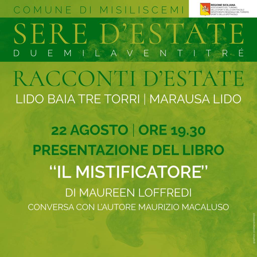 Ultimo appuntamento con la rassegna letteraria “Racconti d’Estate”, organizzata dal Comune di Misiliscemi con la libreria Ubik di Erice nell’ambito delle manifestazioni estive. Martedì 22 agosto alle ore 19.30, al lido Baia Tre Torri di Marausa, sarà presentato “Il Mistificatore”, di Maureen Loffredi, edito da Margana.
