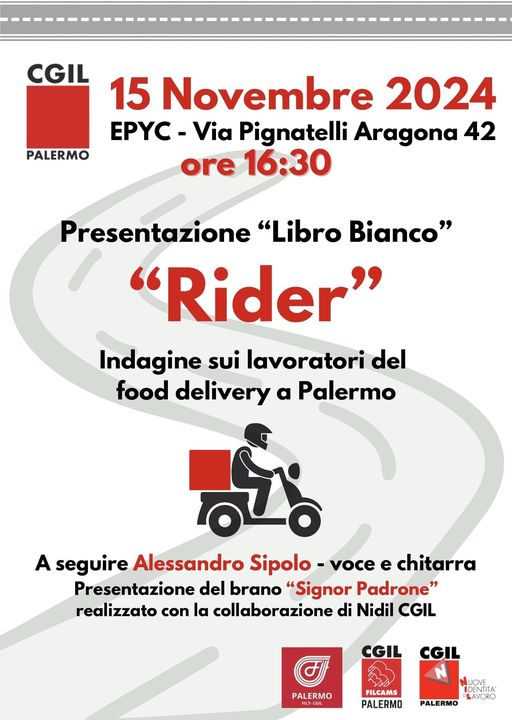 Interverranno alla presentazione: il segretario Cgil Palermo Dario Fazzese, il segretario generale Nidil Cgil Palermo Francesco Brugnone, la rider e segretaria Filt Cgil Palermo Olga Giunta, il segretario generale Filt Cgil Sicilia Alessandro Grasso, il segretario Filcams Cgil nazionale Roberto Brambilla, la segretaria Nidil Cgil nazionale Roberta Turi. E porteranno il loro contributo Paola Marino, giudice del Tribunale di Palermo, sezione Lavoro e Alessandro Bellavista, professore di Diritto del Lavoro all’Università di Palermo. A seguire il cantautore Alessandro Sipolo, voce e chitarra, presenterà il brano “Signor Padrone”, dedicato al lavoro dei rider, realizzato con la collaborazione di Nidil Cgil nazionale.