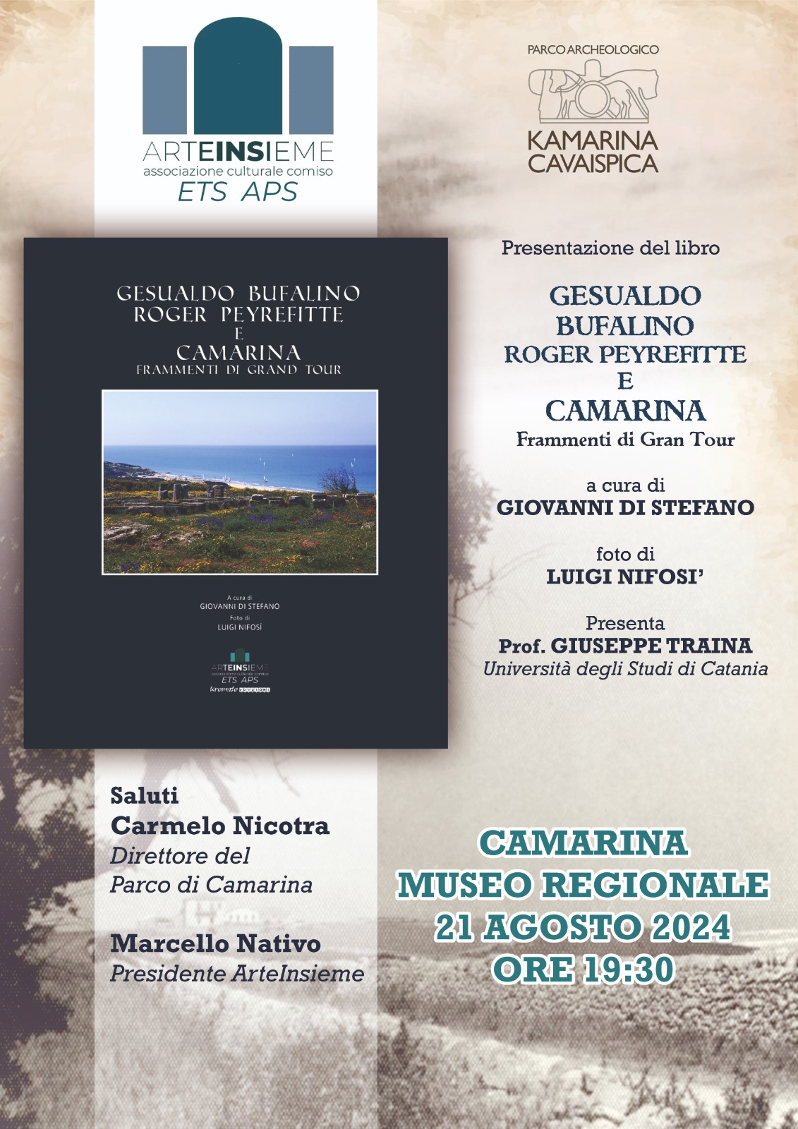 “Protagonista del libro – spiega il presidente di Arteinsieme, Marcello Nativo, con la responsabile delle attività culturali, Marialuisa Occhione – anche questa volta è la bellezza di un luogo mediterraneo che da sempre ha affascinato storici, scrittori, studiosi, artisti, poeti, viaggiatori e non. Camarina viene scelto come meta di un grand tour da Roger Peyrefitte, diplomatico francese, affermato scrittore di formazione classica. Di lui ci parla il grande Gesualdo Bufalino e ce ne parla come solo lui sa fare, accostandolo ai grandi viaggiatori dell’Ottocento e non solo. L’iniziativa editoriale di Arteinsieme è arricchita e completata dal saggio critico di Giovanni Distefano”.