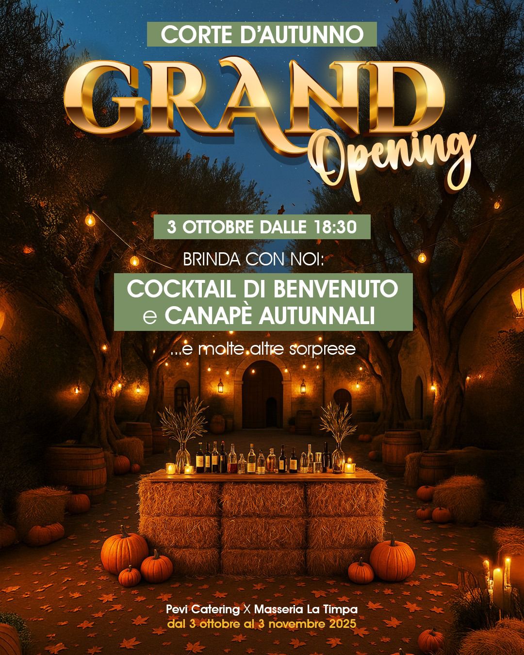 L’evento, organizzato in collaborazione con Giuseppe Pellegrino, famoso bartender e titolare di Pevi Catering, darà ampia valorizzazione anche ai cocktail d’autore creati con ingredienti di stagione, profumi di raccolto ed un’atmosfera rurale. “Siamo felici di questa collaborazione enogastronomica che ci permette di confrontare le specifiche professionalità e di creare qualcosa di originale” afferma Giuseppe Pellegrino.