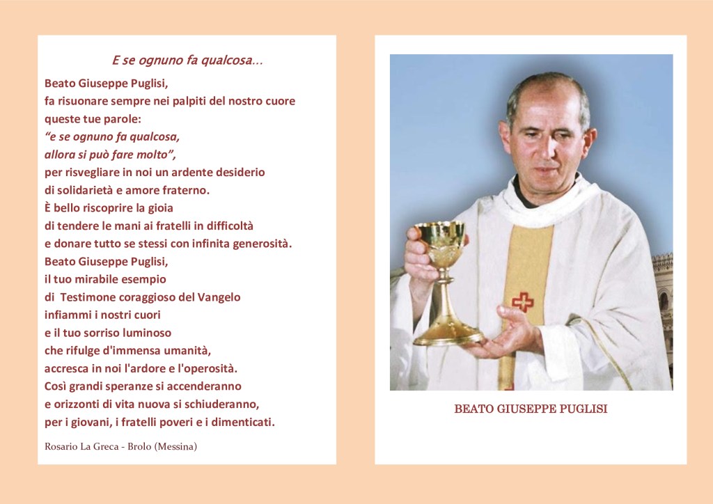 Per l’occasione dell’anniversario del suo martirio, ho il piacere di condividere la mia lirica “E se ognuno fa qualcosa…” con tutti gli estimatori del Beato Pino Puglisi, che continua a vivere tra le strade e la gente di Brancaccio e all’interno del Centro di Accoglienza Padre Nostro, uno dei luoghi propulsivi dei suoi insegnamenti.