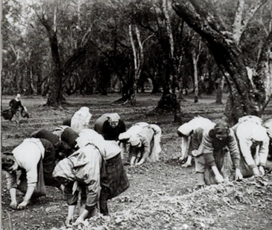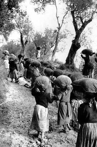 Ci si alzava presto, alle prime luci dell’alba, si aspettavano le altre lavoranti davanti a un fuoco scoppiettante, dove la pentola per l’orzo era già pronta e, dopo il buongiorno si partiva tutti insieme. Le più giovani canticchiavano mentre si inerpicavano su per il sentiero fangoso, irto e scivoloso. Le più anziane sprofondavano con le loro scarpe larghe e consunte nel fango e talvolta imprecavano contro il destino e la miseria. Alcune venivano a piedi dalle case vicino al luogo della raccolta (erano le più fortunate…) altre con un carretto trainato da un asino.
