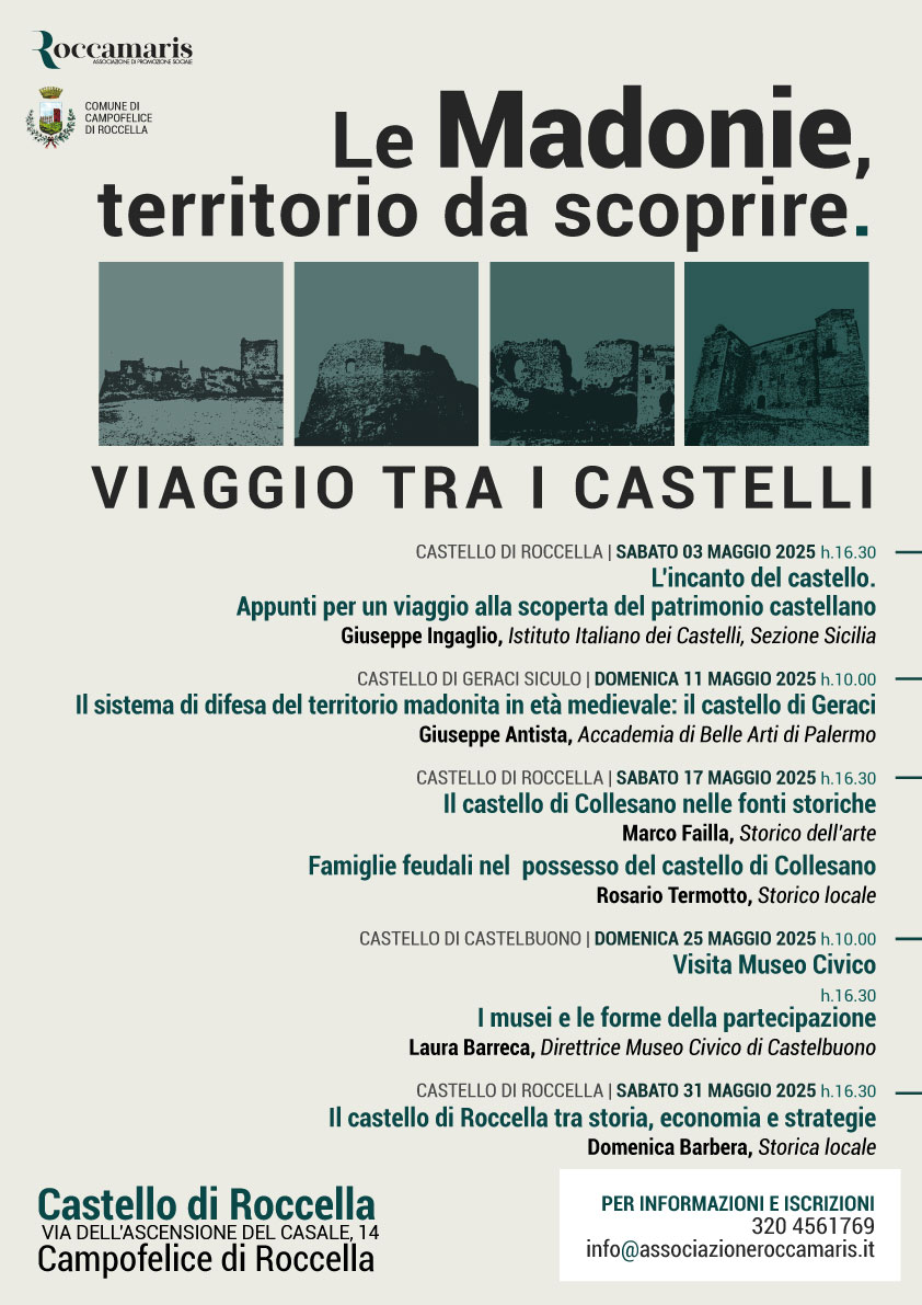 Domenica 11 maggio a Geraci Siculo poi Giuseppe Antista, dell’Accademia di Belle Arti di Palermo, ci farà conoscere il Castello del comune montano e “Il sistema di difesa del territorio madonita in età medievale”. Sabato 17 maggio, sempre all’interno del Castello di Roccella lo storico locale Rosario Termotto e lo storico dell’arte Marco Failla ci aiuteranno ad approfondire la conoscenza del Castello di Collesano, le fonti storiche e le famiglie feudali.