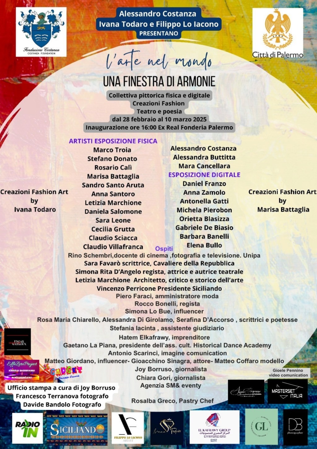 La manifestazione, curata da Alessandro Costanza, Ivana Todaro e Filippo Lo Iacono, si terrà dal 28 febbraio al 10 marzo 2025 presso l’ex Real Fonderia di Palermo, con inaugurazione prevista per le ore 16. L’evento offrirà una panoramica artistica ricca e variegata, articolata in esposizioni pittoriche fisiche e digitali, creazioni fashion e momenti dedicati al teatro e alla poesia.