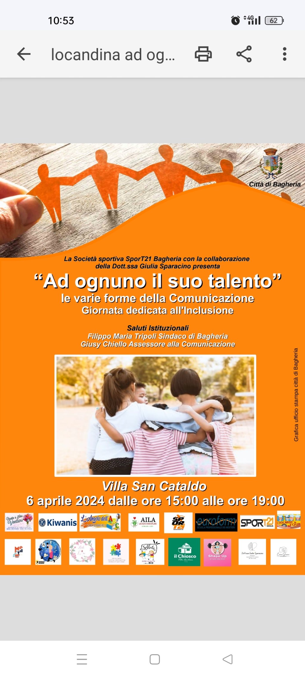 La società sportiva SporT21 Bagheria con la collaborazione di Giulia Sparacino, Pedagogista e Analista del Comportamento ABA in formazione, patrocinate dal Comune di Bagheria, in base al progetto: “L’inclusione che corre veloce” apriranno le porte di Villa San Cataldo, giorno 6 aprile 2024 dalle ore 15:00 alle ore 19:00, per una giornata dedicata all’Inclusione “Ad ognuno il suo talento: le varie forme della Comunicazione”.