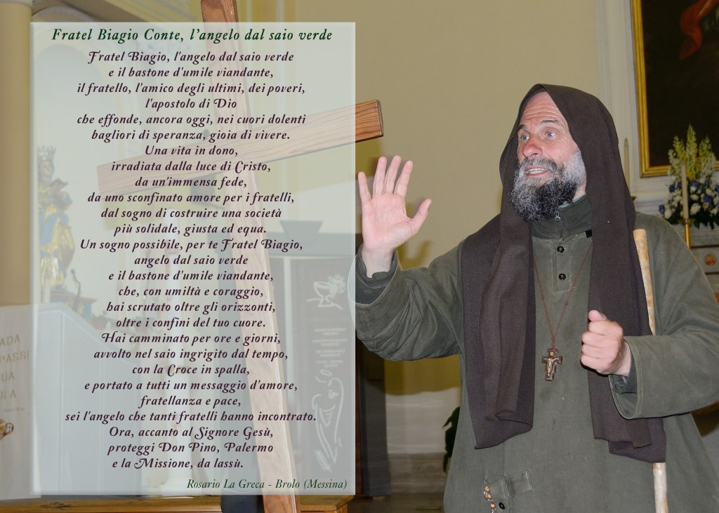 In occasione del secondo anniversario della sua “nascita al cielo”, il poeta Rosario La Greca di Brolo (Messina), legato da fraterna e sincera amicizia con Fratel Biagio, sin dagli inizi dell’anno 2000, ha composto la poesia “Fratel Biagio Conte, l’angelo dal saio verde”. È un segno di omaggio e riconoscenza per Fratel Biagio, fondatore della “Missione di Speranza e Carità”, dove i poveri sono chiamati fratelli e sorelle senza alcuna distinzione, assistiti e ospitati in gratuità. Ha il piacere di condividerla con tutti gli amici e gli estimatori di Fratel Biagio.