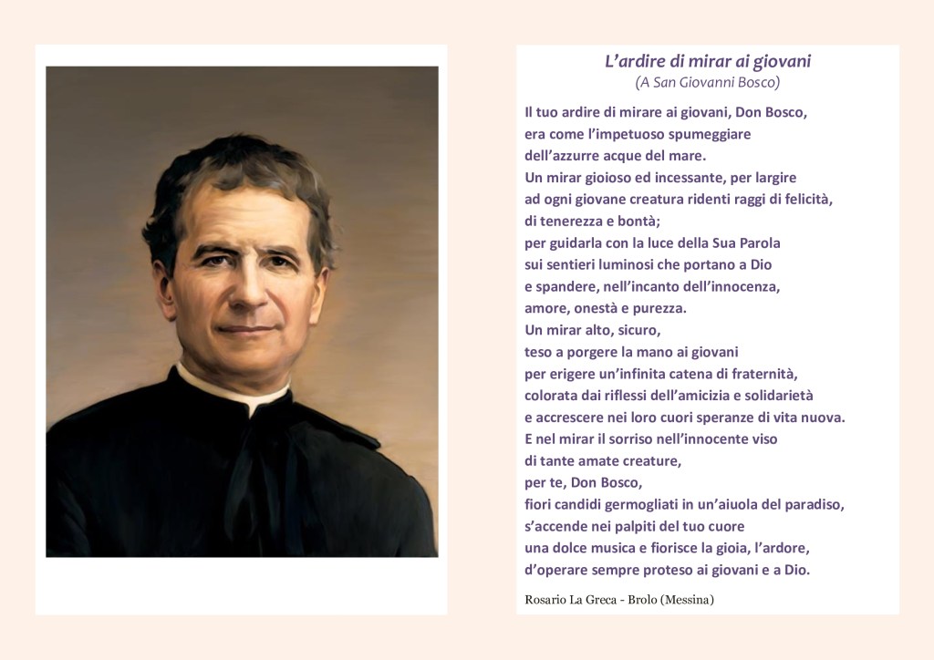 Ho composto la poesia “L’ardire di mirar ai giovani”, dedicata proprio a San Giovanni Bosco, ho il piacere di condividerla con tutti i devoti del Santo “Padre e Maestro della gioventù”.