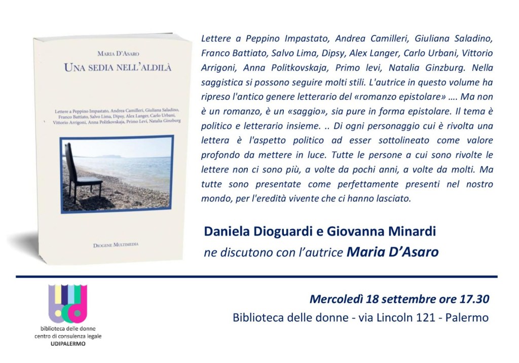 Mercoledì 18 settembre 2024 alle 17.30, Biblioteca delle donne, via Lincoln 121 #Palermo, per la presentazione del libro “Una sedia nell’aldilà” (Diogene Multimedia) di Maria D’Asaro.