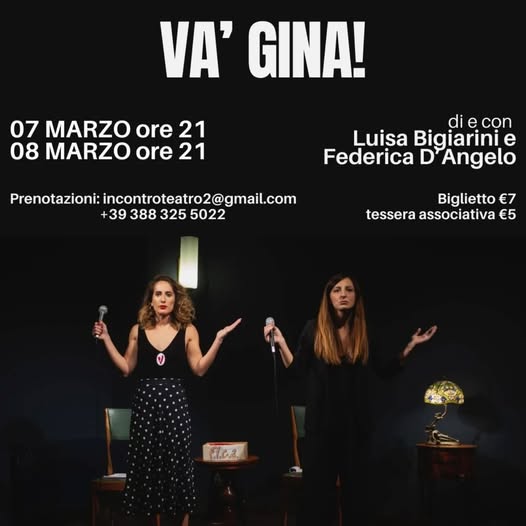 Ed è quello che si ripropongono da fare Luisa Bigiarini e Federica D’Angelo con lo spettacolo “Và Gina!”, scritto, diretto e interpretato da loro stesse, in scena alle 21 di venerdì 7 e sabato 8 marzo al Piccolo Teatro dei Biscottari.