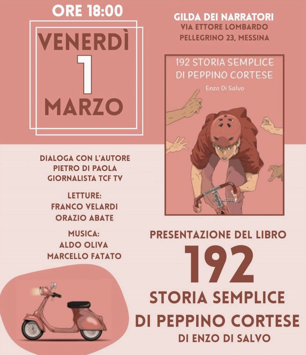 Venerdì 1 marzo a Messina la presentazione di “192 storia semplice di Peppino Cortese”, di Enzo Di Salvo. Si terrà a Gilda dei narratori, in via Ettore Lombardo 23, alle ore 18. Con l’autore interverranno Pietro Di Paola, giornalista Tcf Tv, con le letture di Franco Velardi e Orazio Abate, con le musiche di Aldo Oliva e Marcello Fatato.