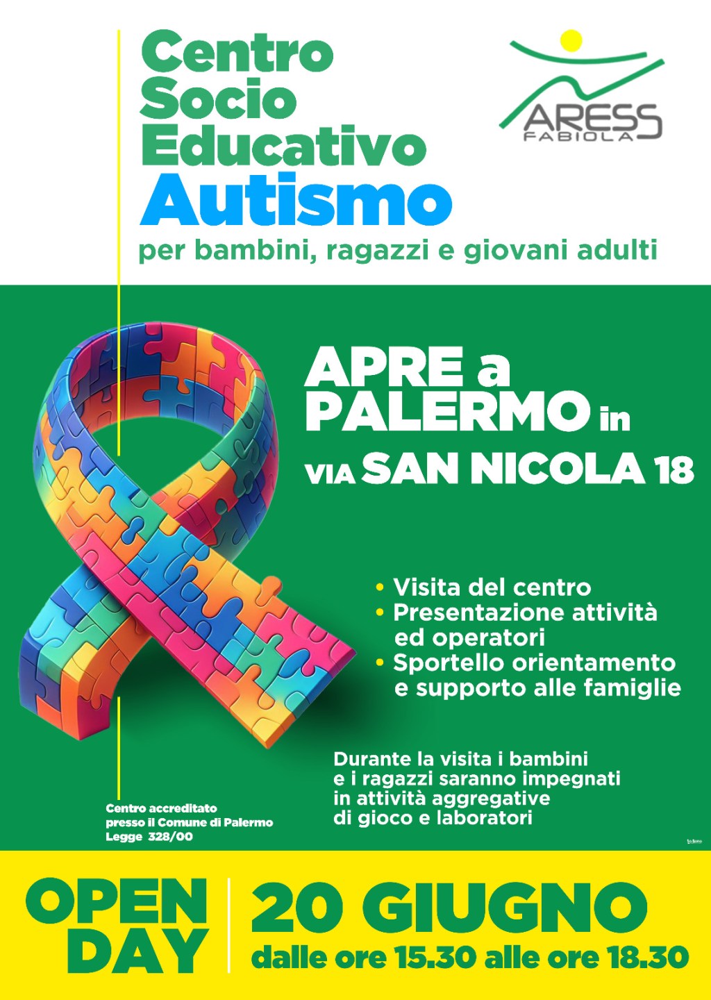 Venerdì 20 giugno l’Aress Fabiola di Termini Imerese organizza l’Open Day del Centro Socio Educativo Autismo di via San Nicola nr. 18 a Palermo. L’appuntamento è fissato dalle ore 15.30 alle ore 18.30 e sarà l’occasione per ogni persona con autismo per trovare supporto, stimoli e opportunità di crescita. Il centro di Via San Nicola è un nuovo punto di riferimento per minori e adulti con sindrome dello spettro autistico ma anche per le famiglie e la comunità palermitana. Grazie all’accreditamento con il Comune di Palermo saranno erogati servizi socio-educativi specifici per le persone con autismo: il centro offrirà supporto, opportunità e percorsi educativi su misura per minori e adulti con sindrome dello spettro autistico.