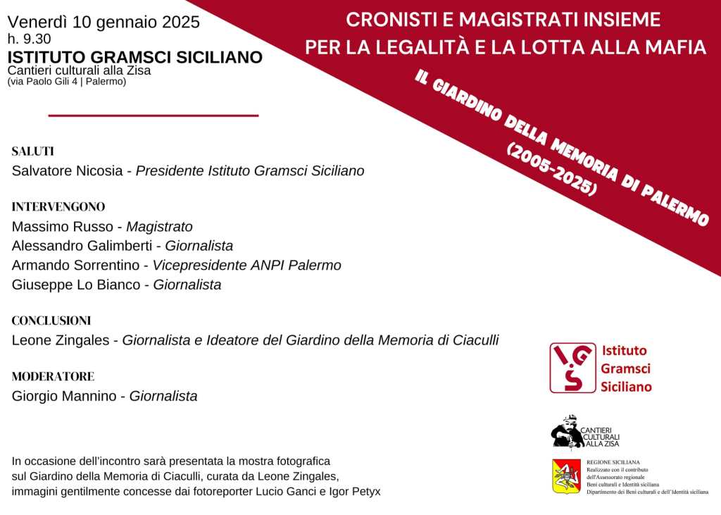 Tutto questo sarà ricordato e celebrato da cronisti e magistrati in occasione dell’evento “Il Giardino della Memoria 2005-2025” che si terrà venerdì 10 gennaio 2025 alle 9,30 nella sala conferenze dell’Istituto Gramsci Siciliano ai Cantieri Culturali della Zisa in via Paolo Gili 4 a Palermo.