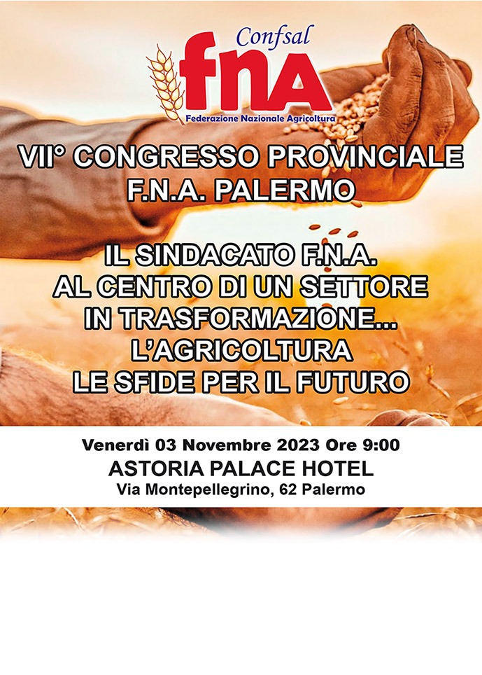 Venerdì 3 novembre alle ore 9:00 presso l’Astoria Palace Hotel (via Montepellegrino, 62 – Palermo) si terrà l’atteso VII° Congresso provinciale della Federazione Nazionale Agricoltura.