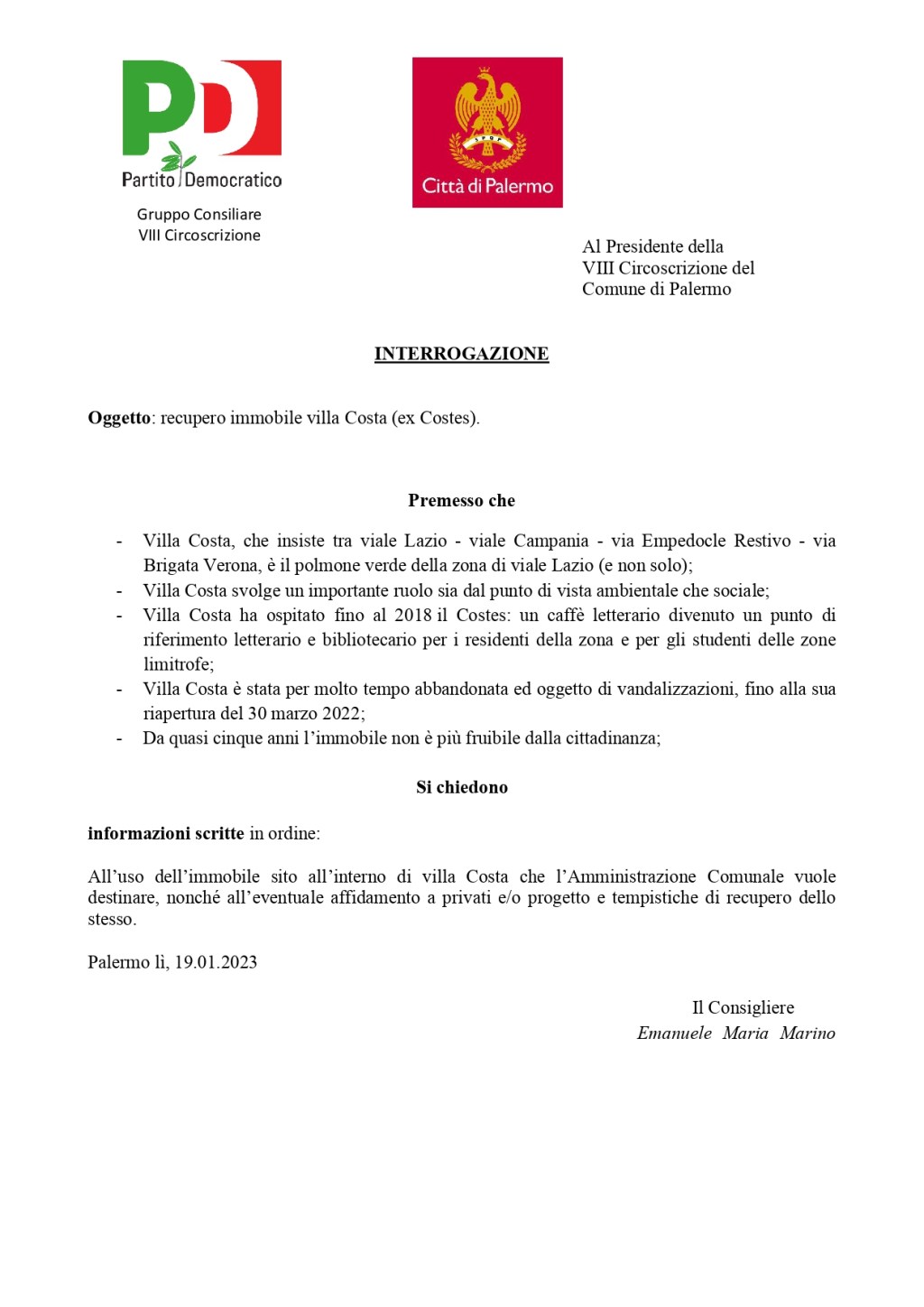Comunale come intenda recuperare ed usare l’immobile di Villa Costa” – ha dichiarato il Cons. Marino