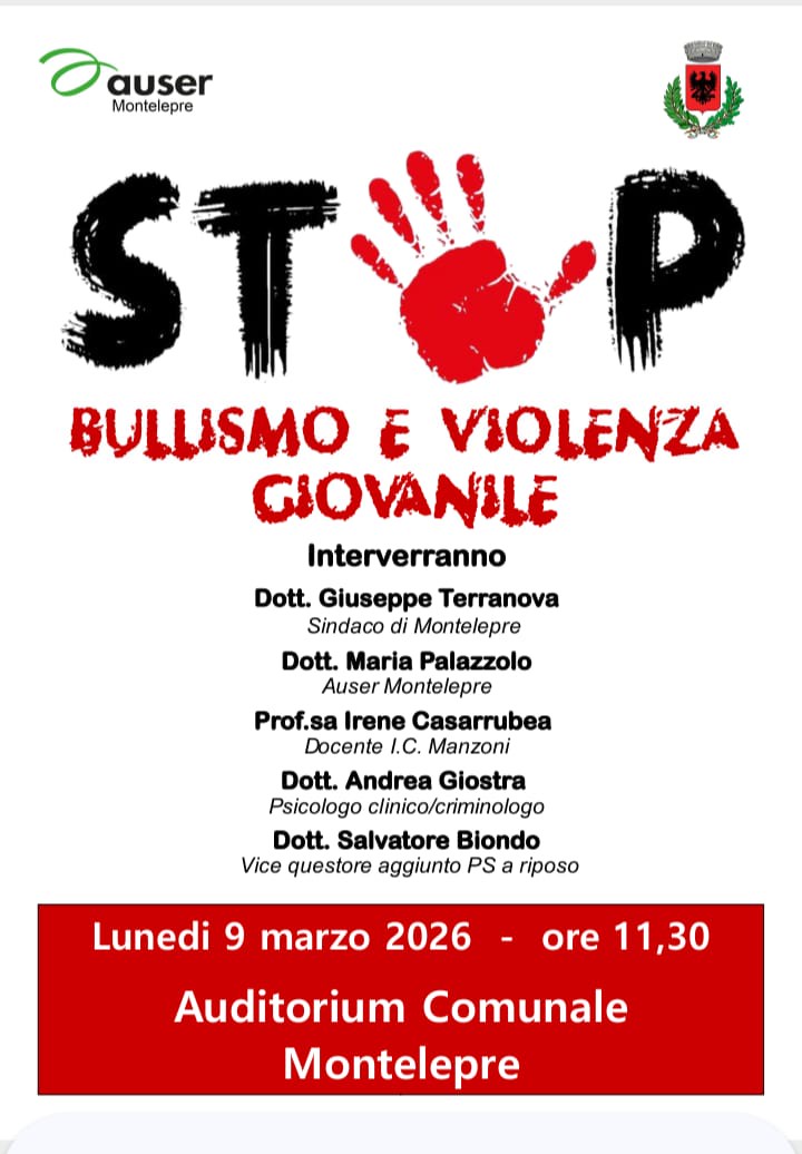 Oggi, lunedì 9 marzo con inizio alle ore 11:30, presso l’Auditorium Comunale di Montelepre, si terrà una Conferenza dal titolo “Bullismo e Violenza Giovanile”, che ha per tema la lettura scientifica ed esperienziale del fenomeno, la prevenzione e il fornire ai giovani scolari dell’Istituto Comprensivo Statale “A. MANZONI” di Montelepre-Giardinello strumenti per capire cosa fare e come intervenire in questi casi.