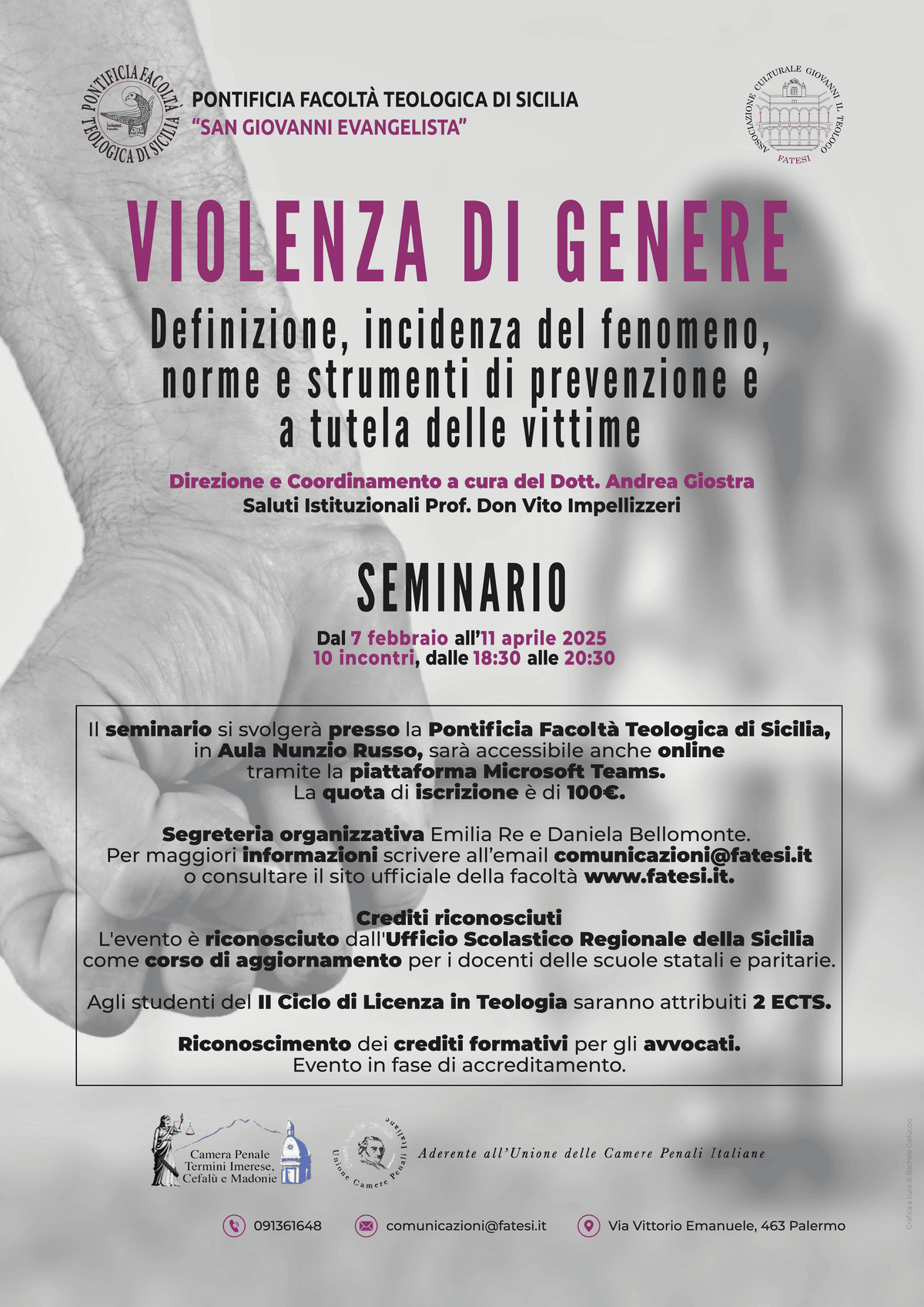 A seguito del successo ottenuto dal Convegno sulla “Violenza di Genere” di sabato 9 novembre 2024 tenuto presso l’Aula Magna della Pontificia Facoltà Teologica di Sicilia, il Preside Prof. don Vito Impellizzeri ha pensato di organizzare e promuovere un Ciclo di Seminari di approfondimento sullo stesso tema per affrontare e spiegare adeguatamente il fenomeno e gli aspetti di tutela e protezione della Donna vittima di abusi, violenza e maltrattamenti.
