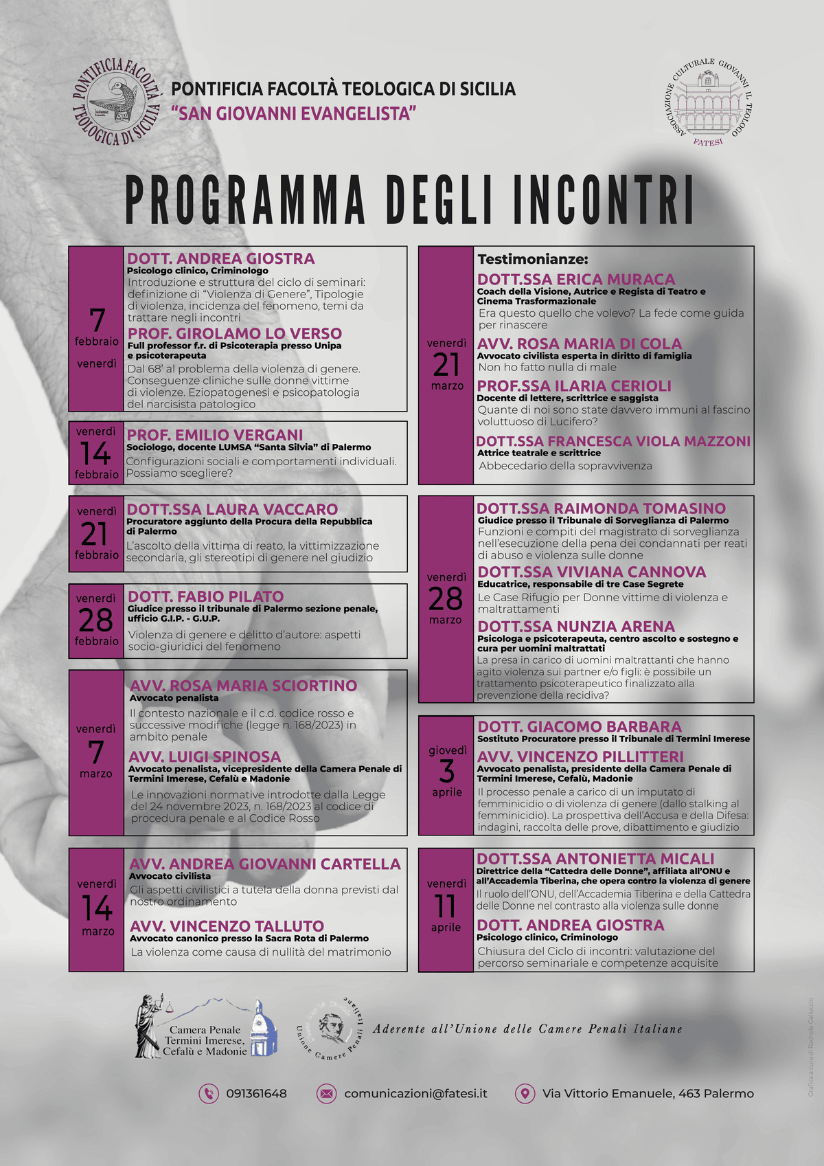 Il Ciclo di Seminari prevede inoltre 4 testimonianze di Donne vittime di Violenza di Genere, che racconteranno le loro storie e di come sono riuscite a liberarsi dei loro aguzzini: Dott.ssa Erica Muraca, Coach della Visione, Autrice e Regista di Teatro e Cinema Trasformazionale; Avv. Rosa Maria Di Cola, avvocato civilista esperta in diritto di famiglia; Prof.ssa Ilaria Cerioli, docente di lettere, scrittrice e saggista; Dott.ssa Francesca Viola Mazzoni, attrice teatrale e scrittrice.