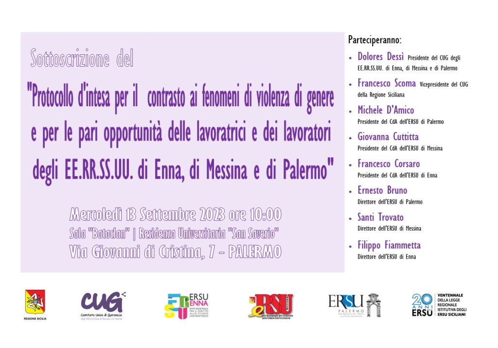 Mercoledì 13 settembre 2023, alle ore 10, presso la Sala Bataclàn della residenza Universitaria San Saverio (Via G.Di Cristina 7, a Palermo), avverrà la sottoscrizione del protocollo d’Intesa per il contrasto ai fenomeni di violenza di genere e per le pari opportunità delle lavoratrici e dei lavoratori in servizio presso gli ERSU di Palermo, Messina ed Enna.