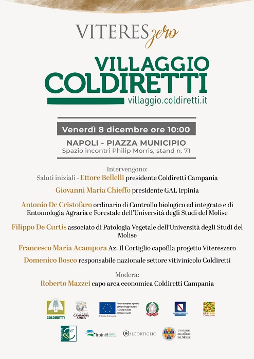 Venerdì 8 dicembre 2023 alle ore 10, presso lo spazio incontri Philip Morris, stand n. 71 c/o Villaggio Coldiretti di Natale a Napoli situato in Piazza Municipio, si terrà la presentazione degli ultimi risultati del progetto ViteresZero, di cui l’azienda vitivinicola irpina Il Cortiglio è capofila. Il progetto è finanziato dal PSR Campania 2014/2020 Misura 19-19.2.1 e trova nella Coldiretti Campania un importante punto di slancio per il suo ruolo di divulgazione dei risultati ottenuti dall’implementazione delle strategie previste. Il Cortiglio è un’azienda vitivinicola e olivicola di Fontanarosa (AV) che da sempre opera nel biologico e la cui filosofia si basa sul rispetto dell’ambiente, delle tradizioni e della biodiversità, attraverso l’adozione di tecniche di coltivazione all’avanguardia, unite alla ricerca e alla sperimentazione in campo agronomico. Ente di ricerca del progetto è l’Università degli studi del Molise, attraverso il Dipartimento Agricoltura, Ambiente e Alimenti, che coordina importanti progetti di ricerca nazionali e internazionali e intrattiene collaborazioni con aziende e industrie del comparto agroalimentare. Soggetto attuatore del progetto invece è il GAL Irpinia che elabora e attua strategie di sviluppo locale dirette a favorire la crescita economica e sociale. Grazie alle sinergie tra imprenditori, associazioni di categoria ed enti, GAL Irpinia è tra i principali artefici dello sviluppo del proprio territorio. Attraverso i polimeri di ViteresZero interrati nei vigneti, infatti, capaci di assorbire l’acqua piovana in eccesso della scorsa primavera, si è riusciti in Provincia di Avellino a contenere i danni delle precipitazioni abbondanti. Inoltre, nei periodi di maggiore siccità estiva, la riserva d’acqua trattenuta dai polimeri ha consentito di evitare lo stress idrico cui di solito la vigna è sottoposta d’estate. Un’azione combinata e sinergica quella rappresentata dall’unione dei polimeri e dei nuovi protocolli fitosanitari messi a punto, rivelatasi molto benefica per l’impresa agricola.