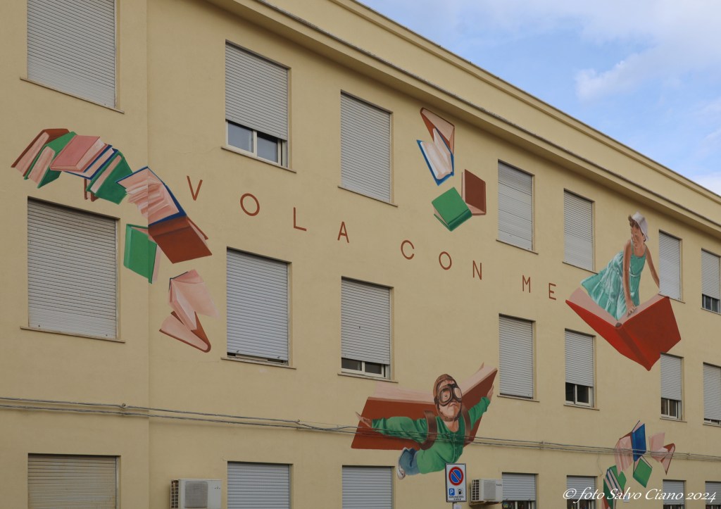 “Questo intervento è in linea con altre pitture che ho fatto ‘per’ i bambini piuttosto che ‘con’ i bambini – spiega Igor Scalisi Palminteri -, anche se all’interno della scuola, grazie al contributo di Nino Carlotta, abbiamo realizzato un piccolo laboratorio di pittura in connessione con il murale. Mentre io dipingevo all’esterno, infatti, le bambine e i bambini dipingevano all’interno, guidati da Nino, perché ci è sembrato importante coinvolgere i destinatari di questo pensiero, anche se c’è un messaggio importante rivolto ai genitori, che devono sforzarsi di togliere dalle mani tablet e telefonini per promuovere l’educazione alla lettura dei libri a figli e figlie. Oggi l’editoria dedicata ai più piccoli ha fatto passi da gigante: l’offerta è vasta, i libri sono molto belli, i volumi illustrati nelle librerie prendono sempre più spazio, cosa che io e i miei coetanei, da bambini, ci sognavamo. Noi siciliani dobbiamo metterci assolutamente in linea con questa tendenza straordinaria, perché un libro fa volare”.